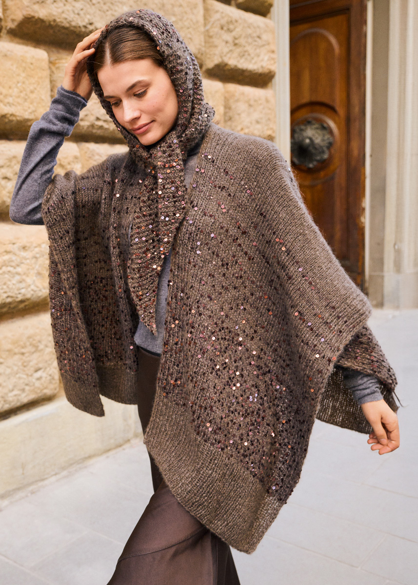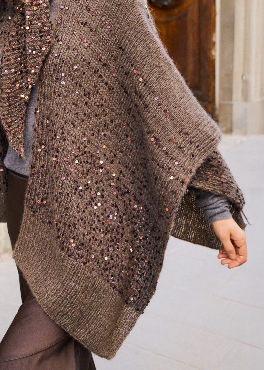 Lana Grossa qualité «Superkid Seta» (65% mohair (superkid), 35% soie, long. de fil = env. 100 m/25 g) : env. 275 g en gris/brun (col. 26) ; Lana Grossa qualité «Cosmo» (100 % coton (plus paillettes), long. de fil = env. 260 m/100 g) : 200 g en mocca (col. 6) ; aig. à tric. n° 6.