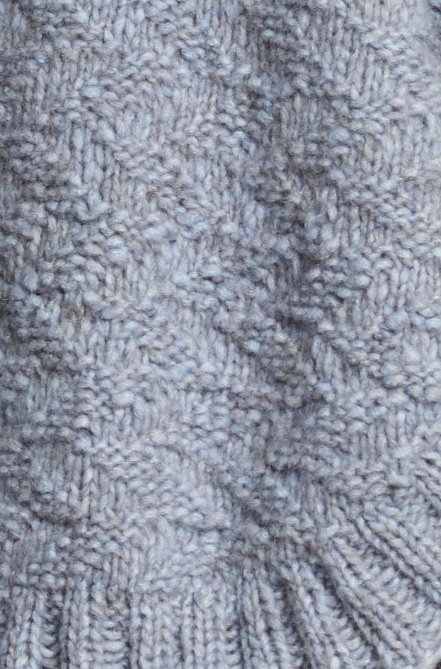 Lana Grossa qualité « Yak Merino » (30% laine vierge (mérinos), 28% (baby) alpaga, 22% polyamide, 20 % yack, long. de fil = env. 110 m/50 g) : env. 450 g en gris/bleu chiné (col. 17) ; aig. circ. n° 6,5, 60 et 120 cm de long., aig. circ. n° 7,5, 100 cm de long., jeu d´aig. n° 7,5 ; 2 boutons chez Union Knopf, art. n° 452531, Ø 28 mm, col. 76 gris chiné