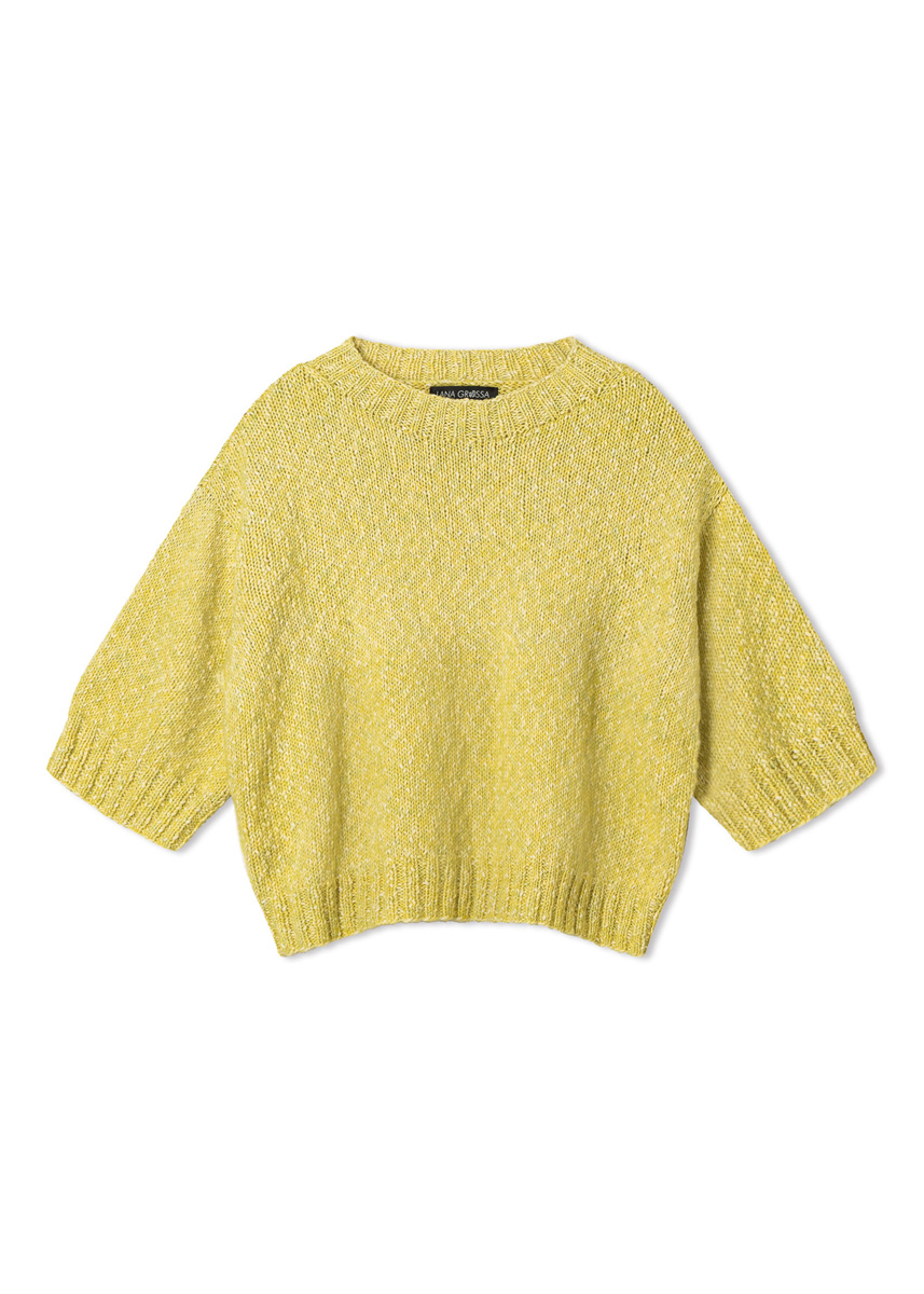 Lana Grossa qualité « Bottoni » (53% coton, 24% viscose, 23% laine vierge (mérinos extrafine), métrage environ 125 m/50 g) : environ 400 (400 - 450 - 450) g jaune citron/ crème (col. 19) ; aiguilles à tricoter de taille 3,5 et 4,5 ; 1 aiguille à tricoter circulaire courte de taille 3.