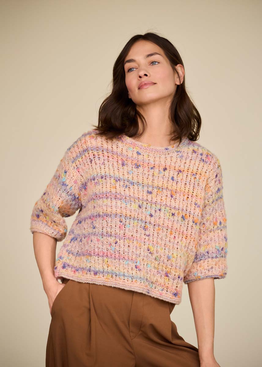 Lana Grossa qualité Cassata (54 % laine vierge (mérinos extrafin), 30 % polyamide, 16 % coton, LL = env. 175 m/50 g) : 150 (200 - 200 - 250) g pêche/bleu/ jaune/orange/lilas (col. 1) ; aiguilles à tricoter n° 4,5 et 6 ; 1 aiguille circulaire courte n° 4,5.