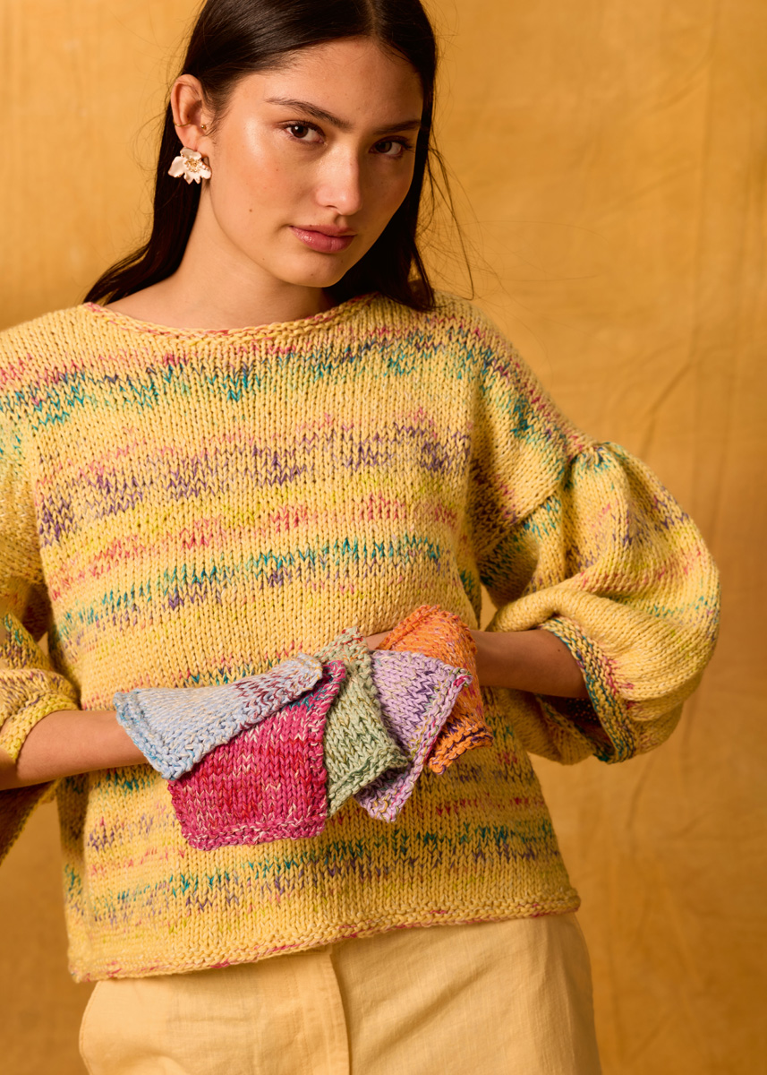 Lana Grossa qualité « Gomitolo California » (66% coton, 30% chanvre, 4% lin, métrage = env. 300 m/100 g) : env. 3 (3 - 4 - 4) pelotes = env. 300 (300 - 400 - 400) g vanille/ fuchsia/pistache/bleu-violet/bleu pétrole/ vieux rose (col. 3043) ; Lana Grossa qualité « Cotonella » (100% coton (Pima), métrage = env. 140 m/50 g) : env. 6 (6 - 7 - 8) pelotes = env. 300 (300 - 350 - 400) g jaune (col. 205) ; aiguilles circulaires courtes et longues de tailles 4 et 5 ; aiguilles à double pointe de taille 4.