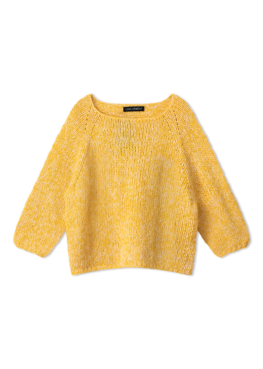 Lana Grossa qualité Summer Softness (80 % coton (bio), 20 % laine vierge (mérinos superfine), long. de fil = env. 130 m/50 g) : env. 250 (300 - 350 - 400) g en jaune d´oeuf (col. 21) ; Lana Grossa qualité Setasuri Pearls (50 % alpaga (Suri), 22 % soie, 16 % coton, 12 % fibre de verre, long. de fil = env. 140 m/25 g) : env. 75 (100 - 100 - 125) g en beige clair (col. 201) ; aig. circ. courte et longue n° 7 : anneaux marqueurs (AM)