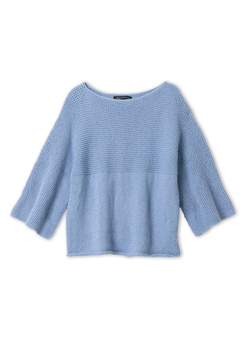 Lana Grossa qualité « Summer Softness » (80% coton (biologique), 20% laine vierge (mérinos superfine), métrage environ 130 m/50 g) : environ 450 (500 - 550 - 600) g bleu clair (col. 30) ; aiguilles à tricoter de taille 5,5.