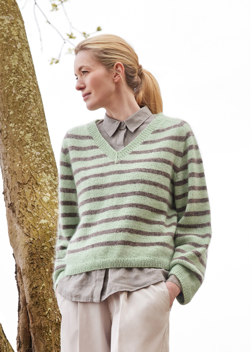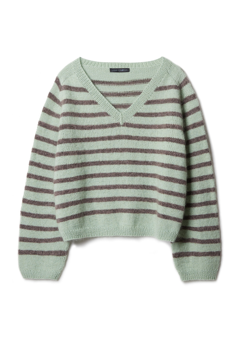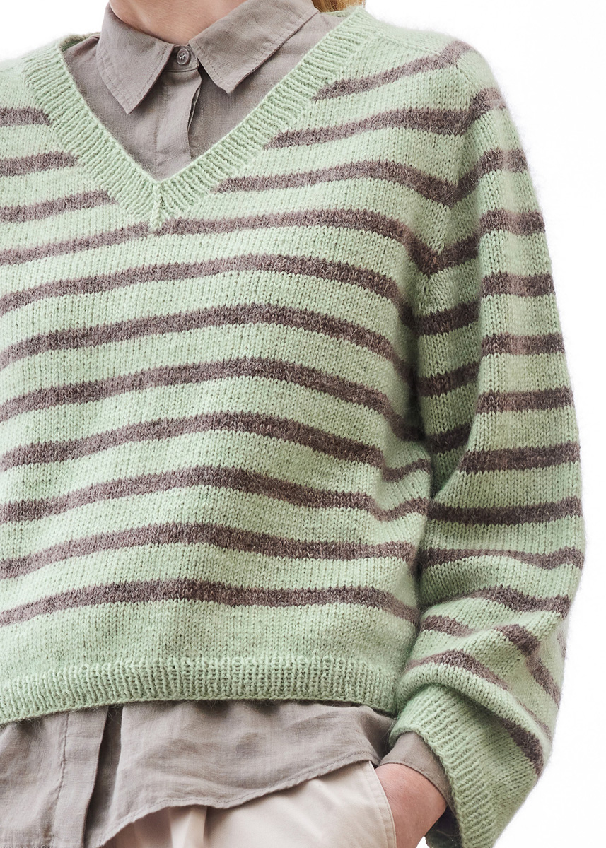 Lana Grossa Merino Superiore (100% laine vierge (mérinos extrafine), long. de fil 180 m/50 g), 250 (300 - 350) g en blanc/vert (col. 49) et 150 (150 - 200) g en brun foncé (col. 9) ainsi que Lana Grossa Silkhair (70% mohair (superkid), 30% soie, long. de fil 210 m/25 g), 100 (125 - 150) g en vert pâle (col. 211) et 50 (50 - 75) g en gris taupe (col. 35). Aig. circ. de 80 cm de long et une de 100 ou 120 cm de long ainsi que 5 aig. d´un jeu d´aig. n° 3,5 ; aig. circ. n° 4 de 50 cm, 80 cm et 100 ou 120 cm de long. 2 aig. aux. pour mettre les m. en attente, 4 AM