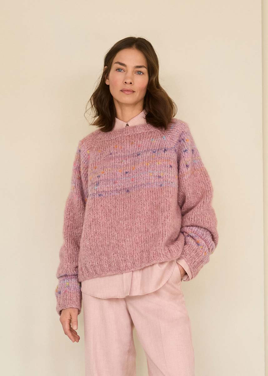 Lana Grossa qualité «Alpaca Air II» (50 % baby alpaga, 27% polyamide, 14 % coton, 9 % laine vierge mérinos), long. de fil =env. 140 m/50 g) : 250 (250 - 300 - 300) g en vieux rose (col. 29), Lana Grossa qualité «Cassata» (54 % laine vierge mérinos extrafine, 30 % polyamide, 16 % coton, long. de fil = env. 175 m/50 g) : 50 (100 - 100 - 100) g en lilas pâle/rose/jaune/lilas (col. 3) ; aig. circ. courte et longue n° 4,5 et 5,5 ; jeu d´aig. n° 4,5.