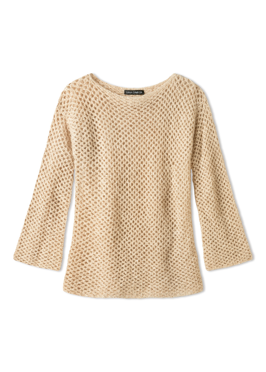 Lana Grossa qualité Setasuri (69 % alpaga (Suri), 31 % soie, long. de fil = env. 212 m/25 g) : env. 150 (150 - 175 - 175) g en beige clair (col. 58) ; Lana Grossa Glamour (55% polyamide, 45% polyester, long. de fil = env. 115 m/25 g) : env. 250 (275 - 300 - 325) g en beige (col. 10) ; crochet n° 4.