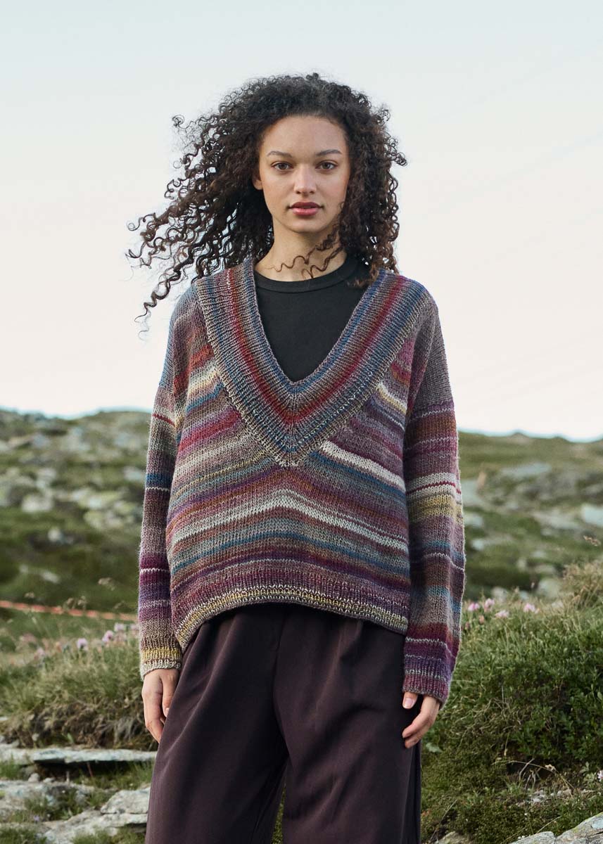 Le pull en V est tricoté de haut en bas en une pièce.