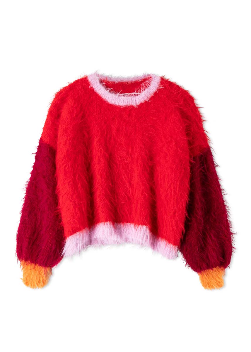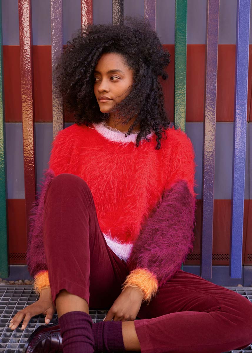 Lana Grossa qualité Basta (50 % laine vierge (mérinos), 50 % polyamide, LL = env. 100 m/50 g) : 250 (300 - 300 - 350) g rouge vif (col. 27), 150 (150 - 200 - 200) g rouge (col. 09), 50 g mandarine (col. 28) et 50 g rose violet (col. 18). aiguilles n° 5 et n° 6 ; une aiguille de 50 cm de long. Tricot circulaire n° 5.