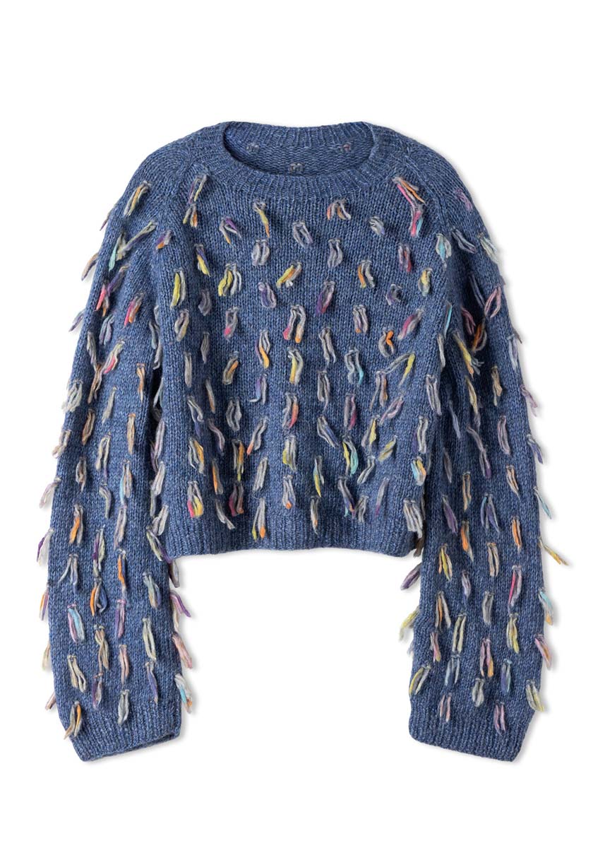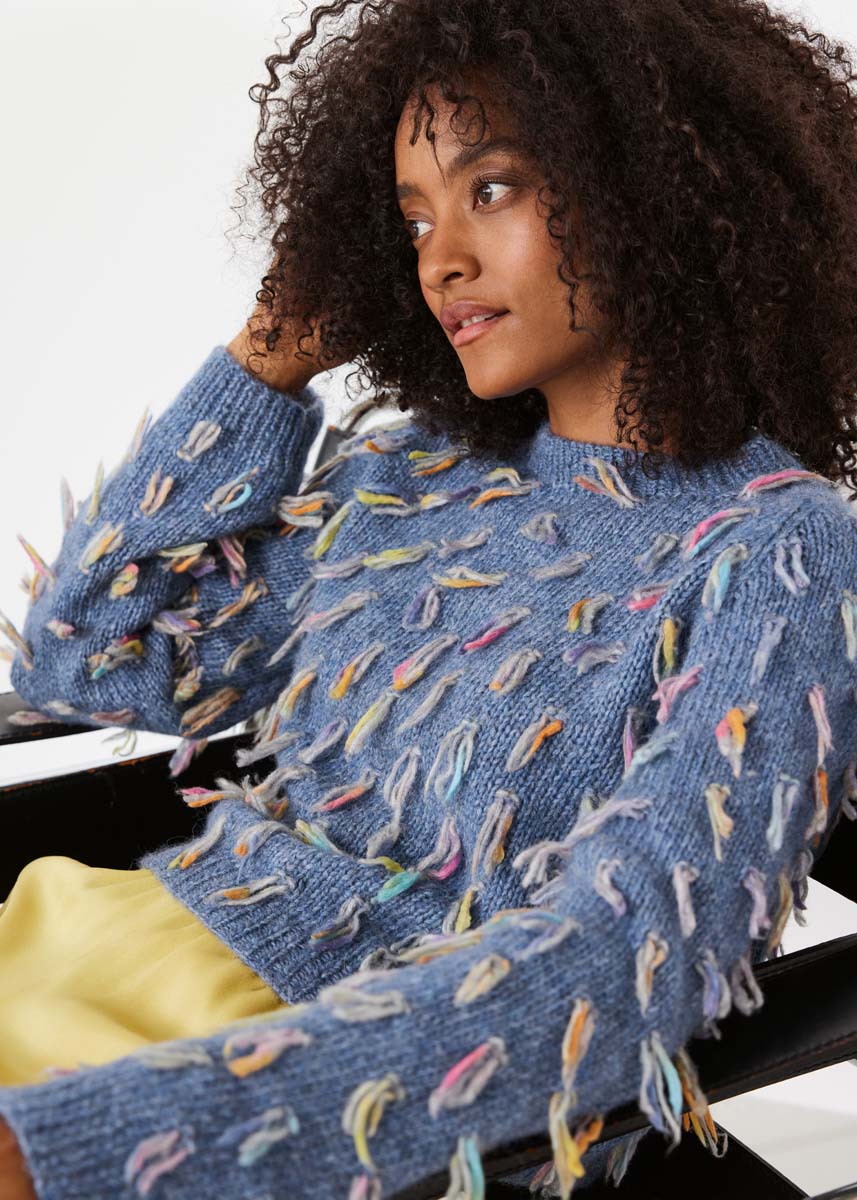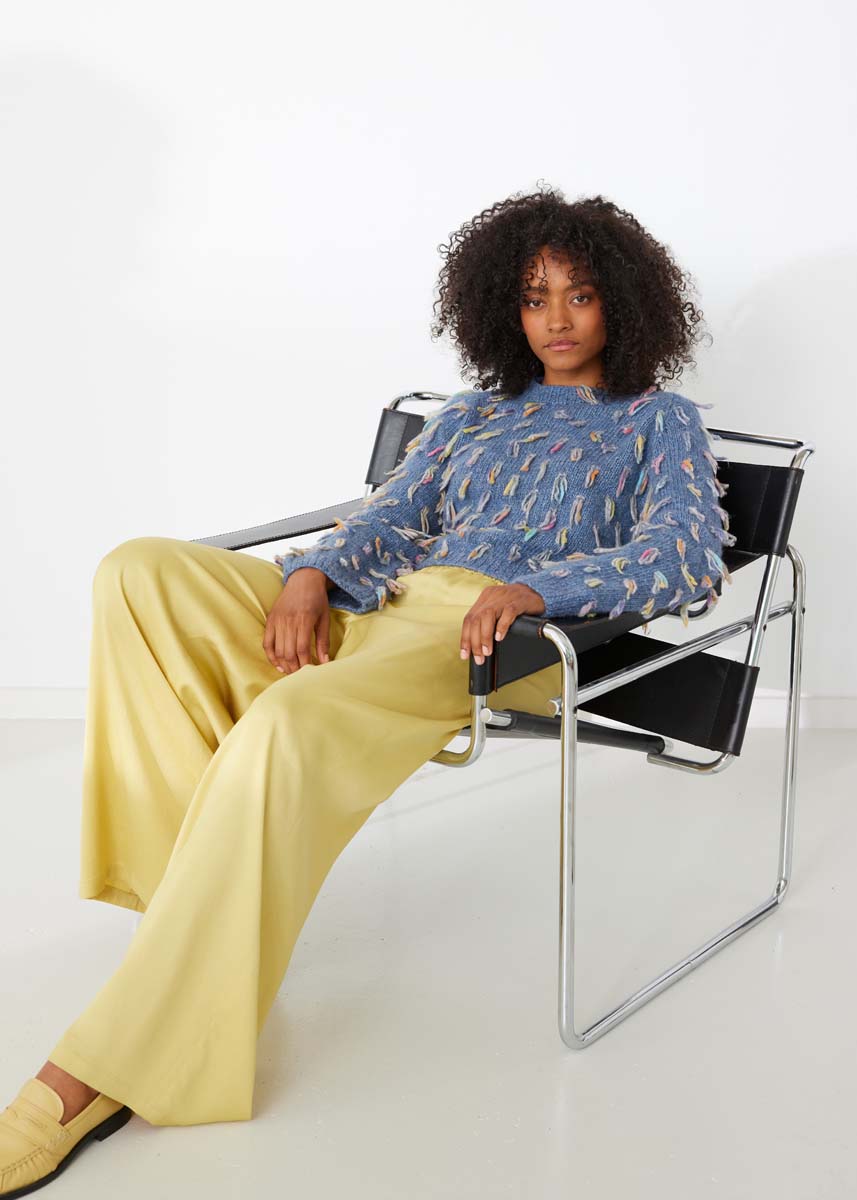 Lana Grossa qualité Brigitte No. 2 (47 % alpaga (bébé), 45 % coton, 8 % laine vierge (mérinos), LL = env. 140 m/50 g) : 300 (350 - 400) g en jean (col. 6) et Lana Grossa qualité Cassata (54 % laine vierge (mérinos extrafin), 30 % polyamide, 16 % coton, LL = env. 175 m/50 g) : 100 (100 - 150) g en gris clair/violet/bleu saphir/jaune pâle/rose grisé/pêche (col. 12) ; aiguilles n° 4 et n° 6 ; une aiguille circulaire de 40 cm n° 4 ; 2 marqueurs ; 4 aiguilles auxiliaires pour mettre des mailles en attente.
