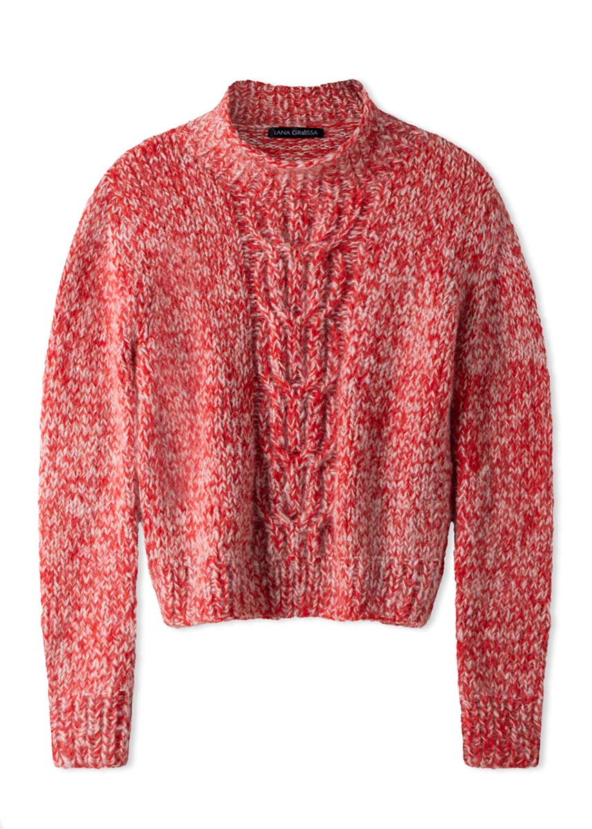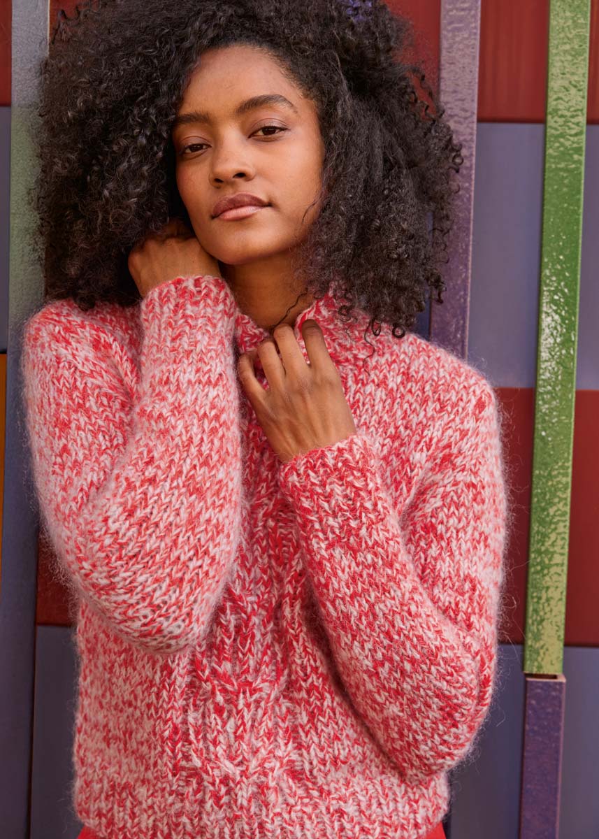 Lana Grossa qualité Brigitte No. 2 (47 % alpaga (bébé), 45 % coton, 8 % laine vierge (mérinos), LL = env. 140 m/50 g) : 250 (300 - 350) g en rouge vif (col. 74) et Lana Grossa qualité Mohair Moda (70 % mohair (kid mohair), 20 % laine vierge (mérinos extrafin), 10 % polyamide, LL = env. 140 m/50 g) : 200 (250 - 300) g en écru (col. 18) ; aiguilles n° 6 et 8 ; u