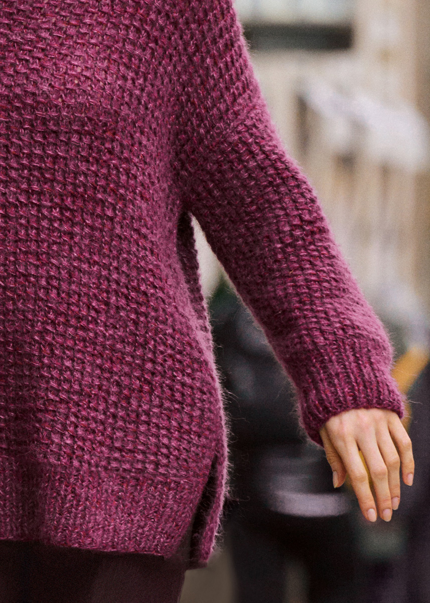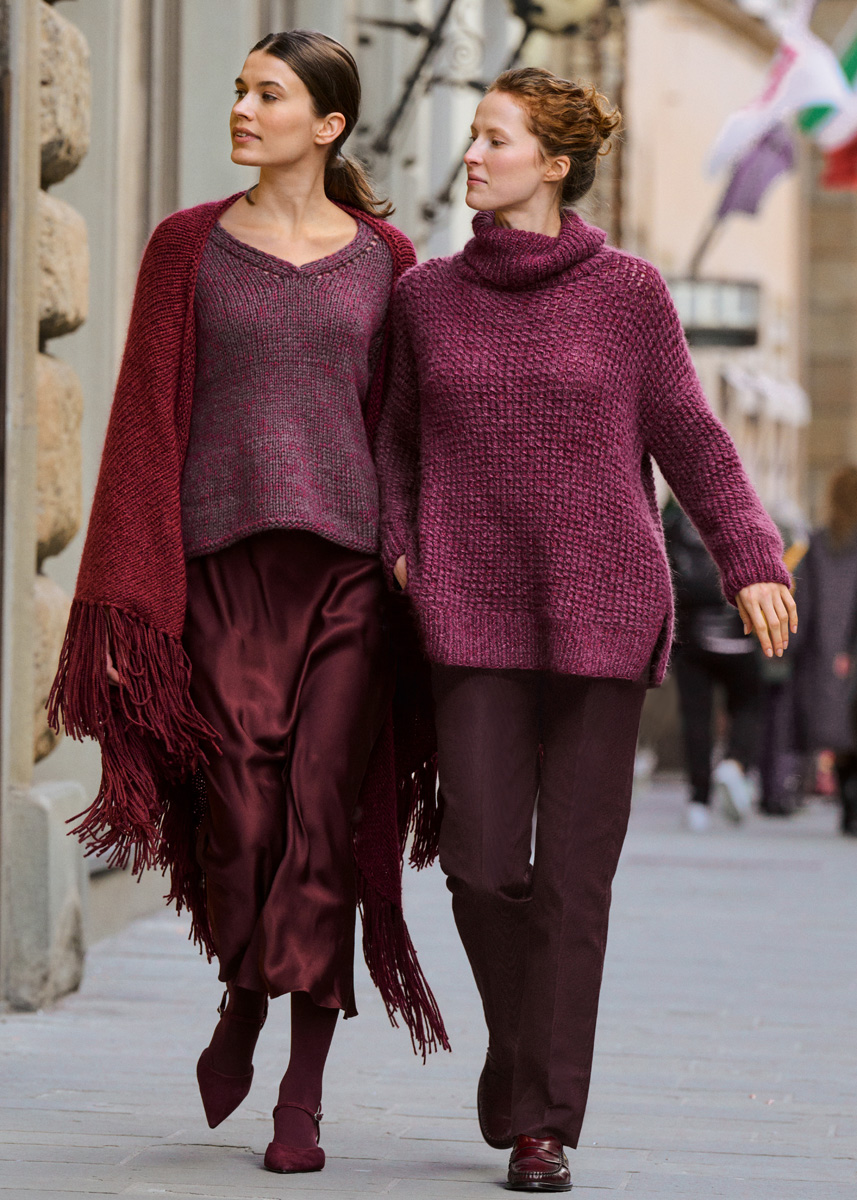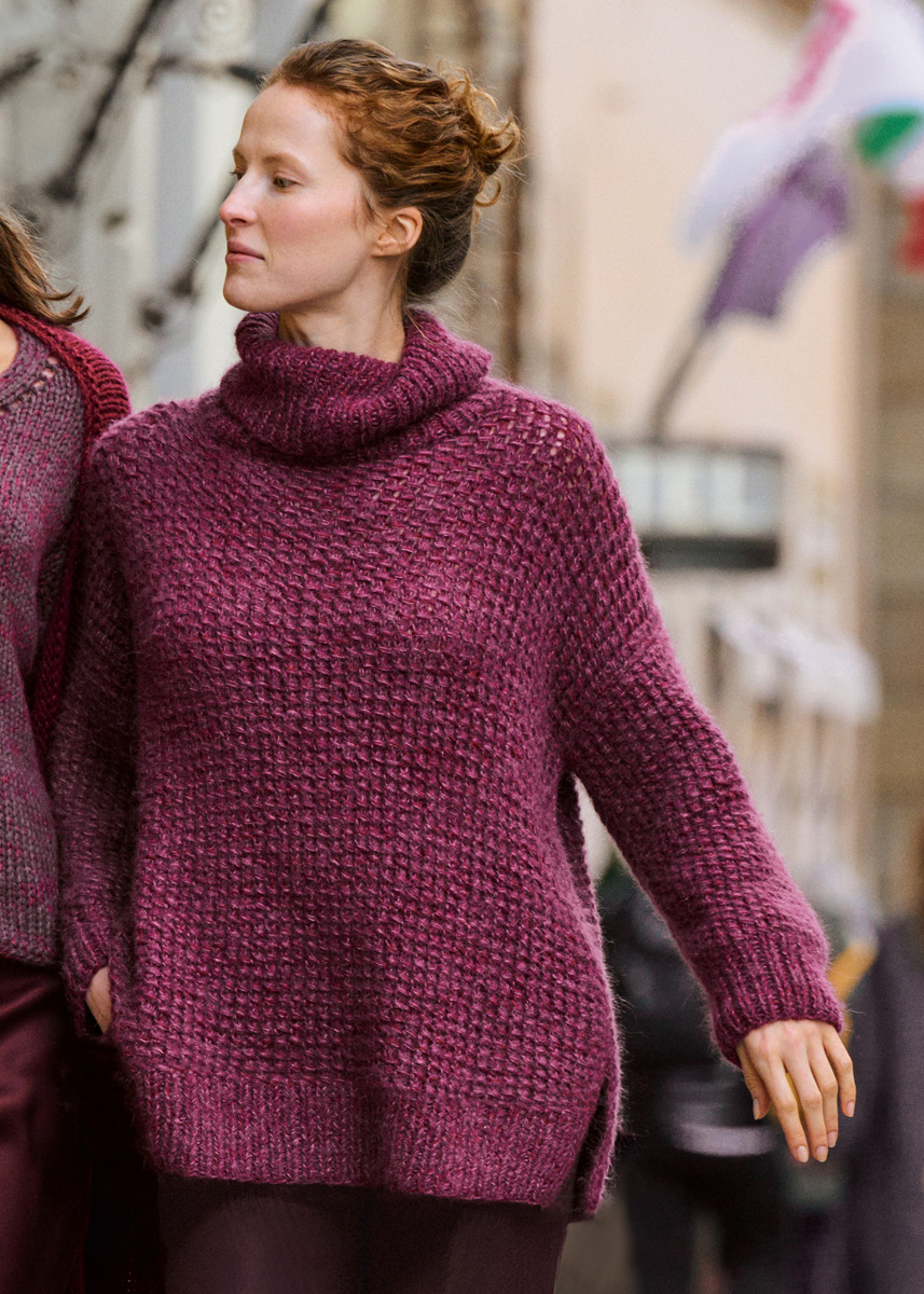 Lana Grossa qualité «Cashmere 16 Fine» (80% laine vierge (mérinos), 10% cachemire, 10% polyamide, long. de fil 320 m/50 g) : env. 100 (150 - 150 - 150) g en bourgogne (col. 58) ; Lana Grossa qualité «Setasuri» (69 % alpaga Suri, 31 % soie, long. de fil = env. 212 m/25 g) : env. 125 (150 - 175 - 200) g en bordeaux (col. 31) ; aig. à tric. n° 7 et 8 ; aig. circ. courte n° 7.