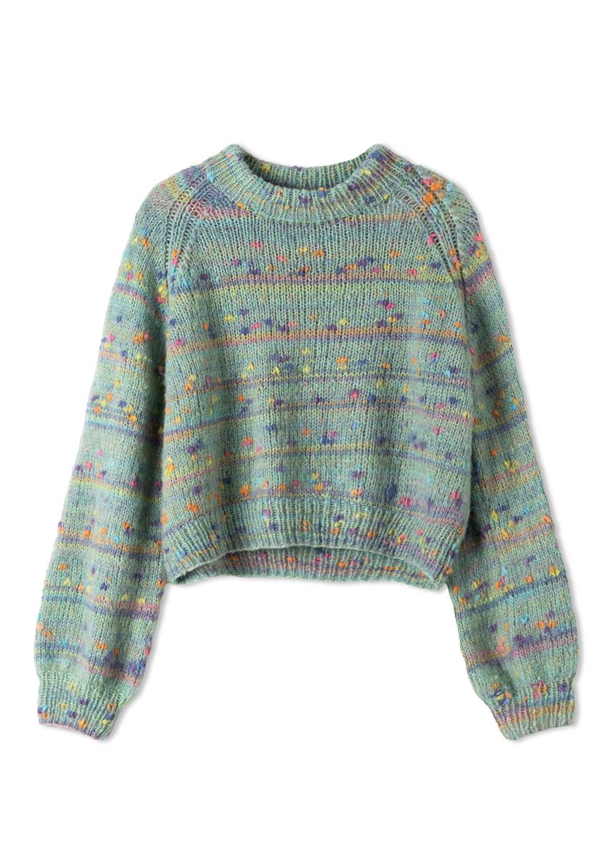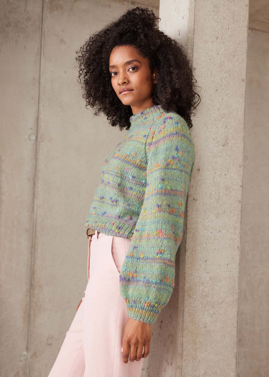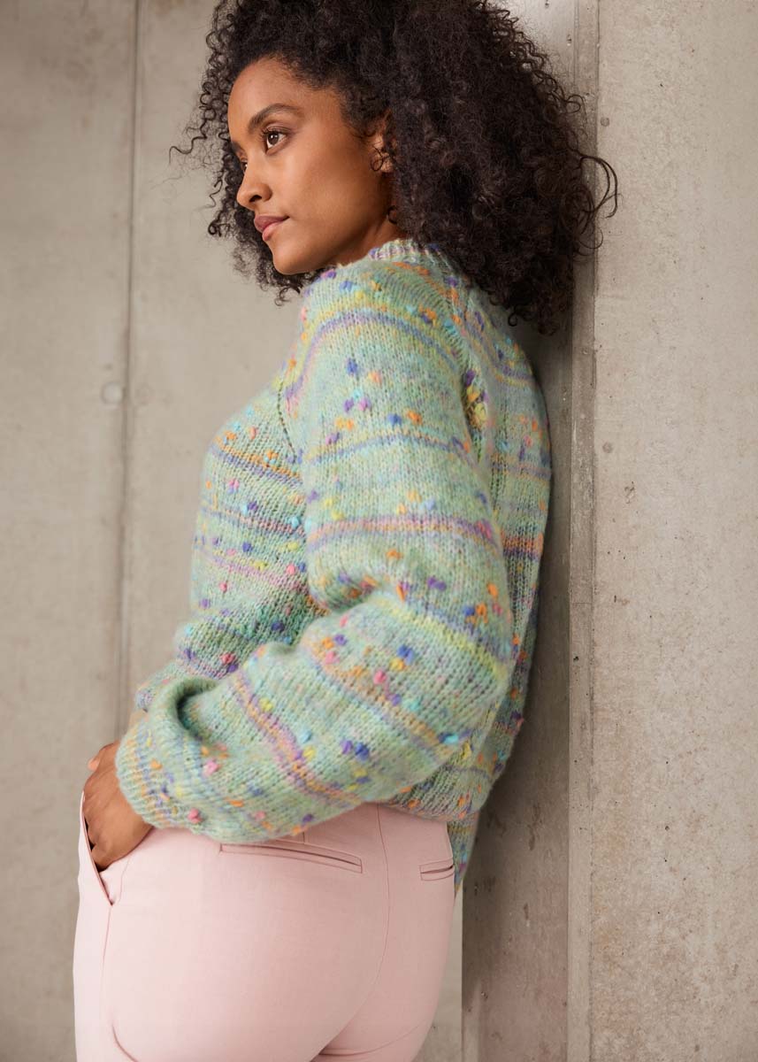 Lana Grossa qualité Cassata (54 % laine vierge (mérinos extrafin), 30 % polyamide, 16 % coton, LL = env. 175 m/50 g) : 250 (250 - 300) g en vert clair/ orange clair/rose/gris clair/violet (col. 11) ; aiguilles n° 3 et n° 5, ainsi qu’une aiguille circulaire de 50 cm n° 3.