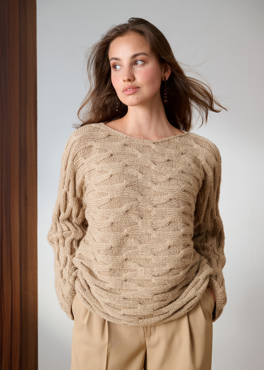 Lana Grossa qualité « Cool Wool » (100% laine vierge (mérinos extra-fine), métrage 160 m/50 g), 350 (400 – 450) g beige perle (col. 2114) et 200 (200 – 250) g gris (col. 2064) ; Lana Grossa qualité « Silkhair » (70% mohair superkid, 30% soie, métrage 210 m/25 g), 125 (150 – 175) g beige clair (col.18). Aiguilles à tricoter de taille 4 et 4,5, et une aiguille circulaire de taille 4, longueur : 40 cm.