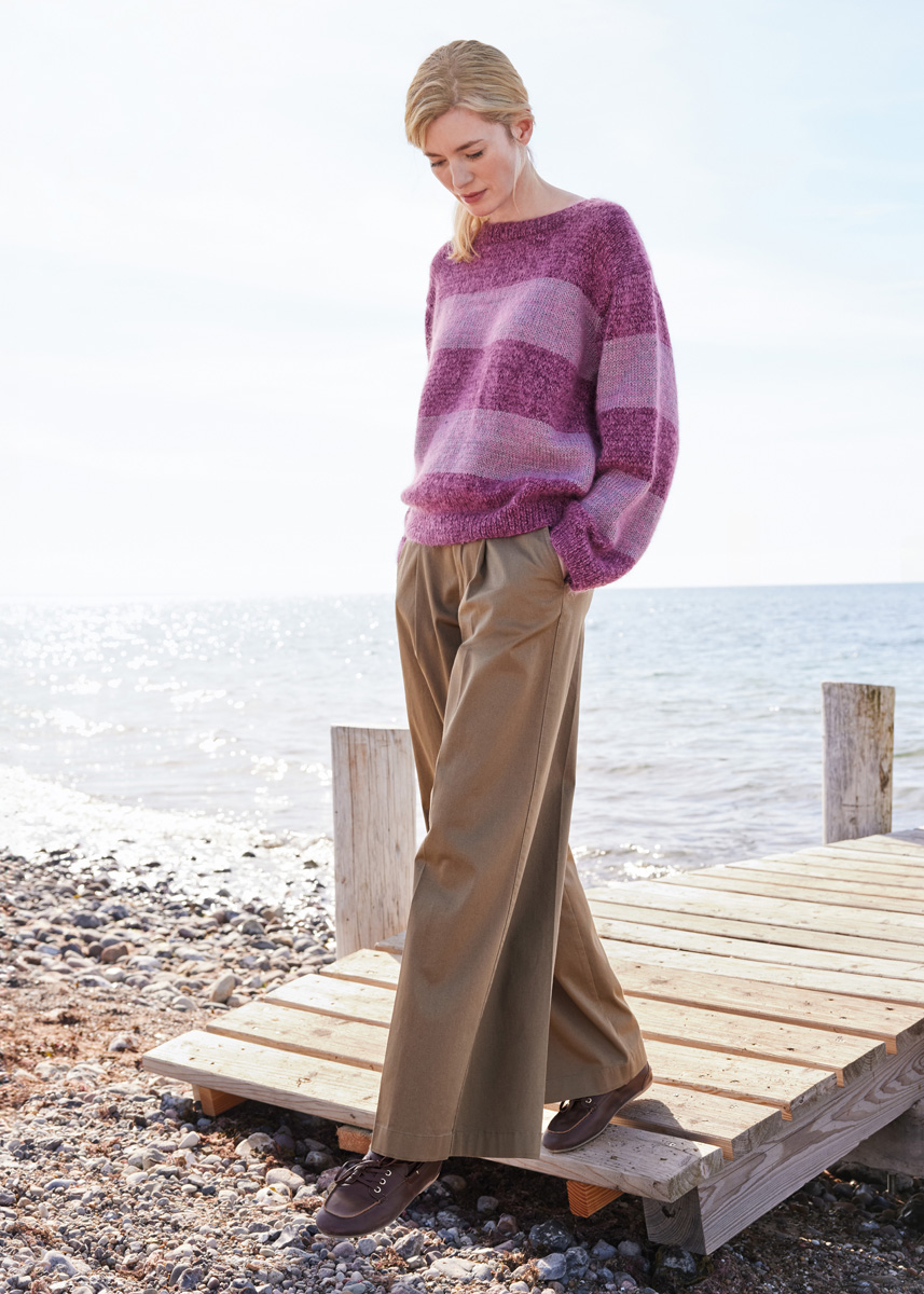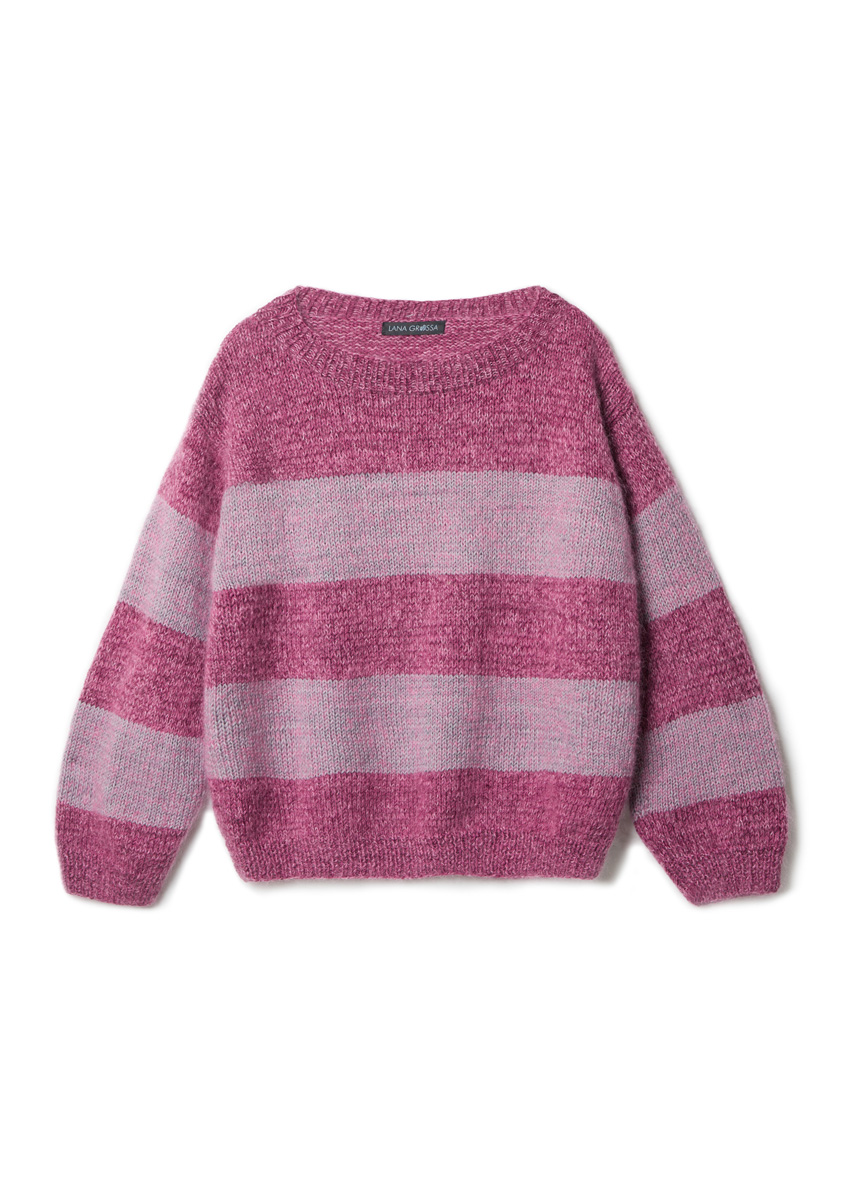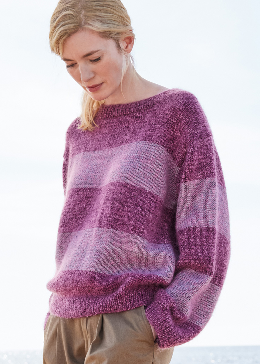 Lana Grossa Cool Wool Vintage (100% laine vierge (mérinos extrafine), long. de fil 160 m/50 g), 150 (200 - 200 - 250) g en gris clair (col. 7369) et 250 (250 - 300 - 300) g en prune (col. 7365), Lana Grossa Silkhair (70% mohair (superkid), 30% soie, long. de fil = env. 210 m/25 g), 150 (150 - 175 - 200) g en rose vif (col. 162). Aig. à tric. n° 4,5 et 5 ainsi qu´une aig. circ. n° 4,5 de 50 cm de long.
