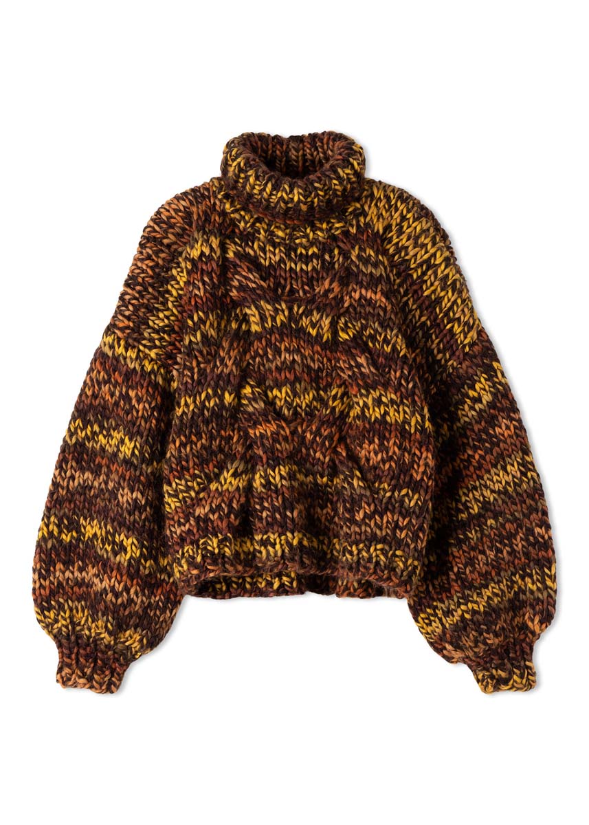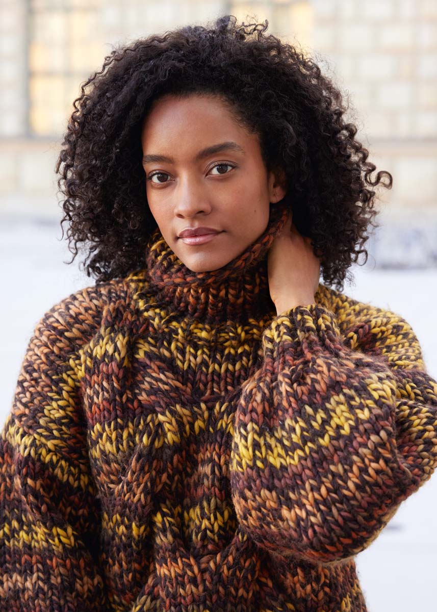 Lana Grossa qualité Dolce (100 % laine vierge (mérinos basolan), LL = env. 50 m/100 g) : 1100 (1200 - 1300) g en noir/brun kaki/jaune/cannelle (col. 2) ; aiguilles n° 12 et n° 15 ; 5 aiguilles à double pointe n° 12 ; 1 aiguille à torsade.