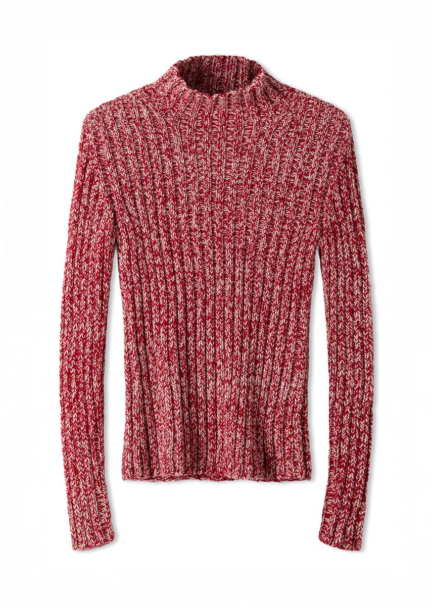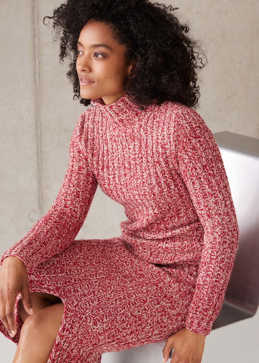 Lana Grossa Ecopuno (72% coton, 17% laine vierge (mérinos), 11% (bébé) alpaga, métrage environ 215 m/50 g), 300 (350 - 400) g en beige perle (col. 66) et 300 (350 - 400) g en rouge cerise (col. 47) ; aiguilles à tricoter et 5 aiguilles à double pointe de taille 4 ; 2 aiguilles auxiliaires pour mettre de mailles en attente.