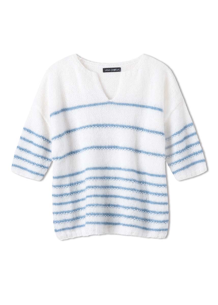 Lana Grossa qualité «Ecopuno» (72 % coton, 17 % laine vierge (mérinos), 11 % (baby) alpaga, long. de fil = env. 215 m/50 g) : env. 200 (250 - 300) g en blanc (col. 26) et env. 50 (100 - 100) g en bleu clair (col. 13) et Lana Grossa qualité «Silkhair» (70% mohair (superkid), 30% soie, long. de fil = env. 210 m/25 g) : env. 100 (125 - 150) g en blanc (col. 117) et env. 25 (50 - 50) g en bleu fumé (col. 202) ; aig. à tric. n° 5 et 5,5, aig. circ. n° 5 de 60 cm de long.