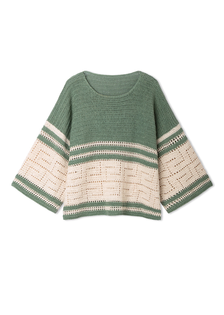 Lana Grossa « Sommer Cashmere » (90 % coton, 10 % cachemire, long. de fil = env. 210 m/50 g) : env. 300 g crème (col. 2) et env. 150 g vert réséda (col. 23) ; 1 crochet n° 3.