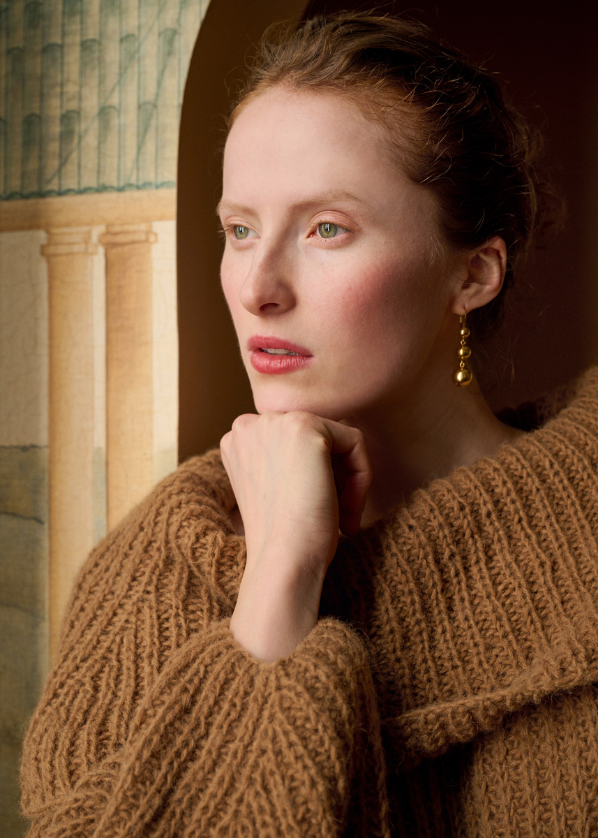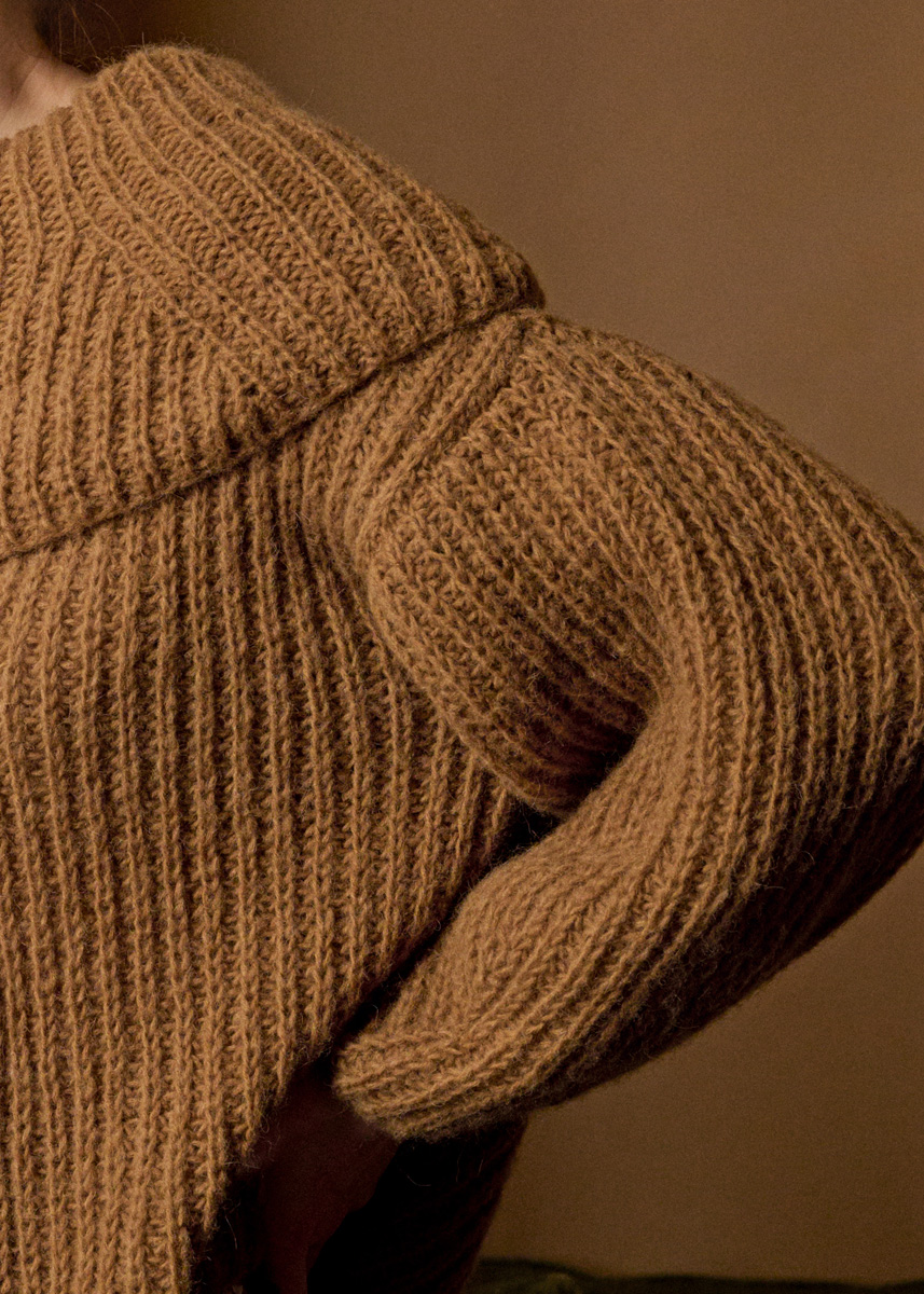 Lana Grossa qualité «Nebbia» (55 % laine vierge (mérinos extra fine), 45 % alpaga (baby), long. de fil = env. 170 m/50 g) : 400 (450 - 450 - 500) g en camel (col. 12) ; aig. à tric. n° 5,5 et 6 ; aig. circ. courte n° 6.