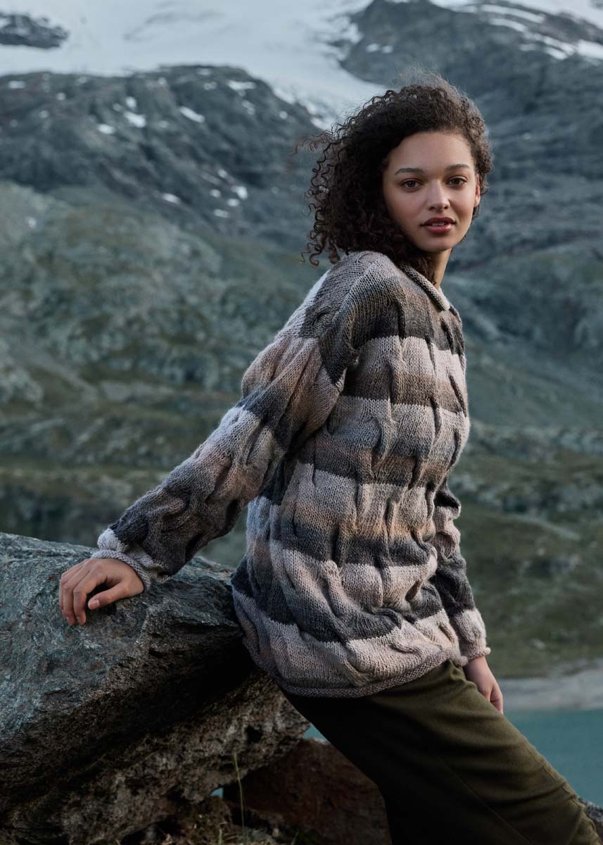 Lana Grossa qualité «Gomitolo Fumo» (50% laine vierge, 50% polyacrylique, long. de fil = env. 700 m/200 g) : 2 (3) pelotes = env. 400 (600) g en gris pâle/gris clair/gris moyen/gris foncé/grège/anthracite (col. 518) ; aig. à tric. n° 4,5 et 5 ; aig. circ. courte n° 4,5 ; 1 aig. à torsade.