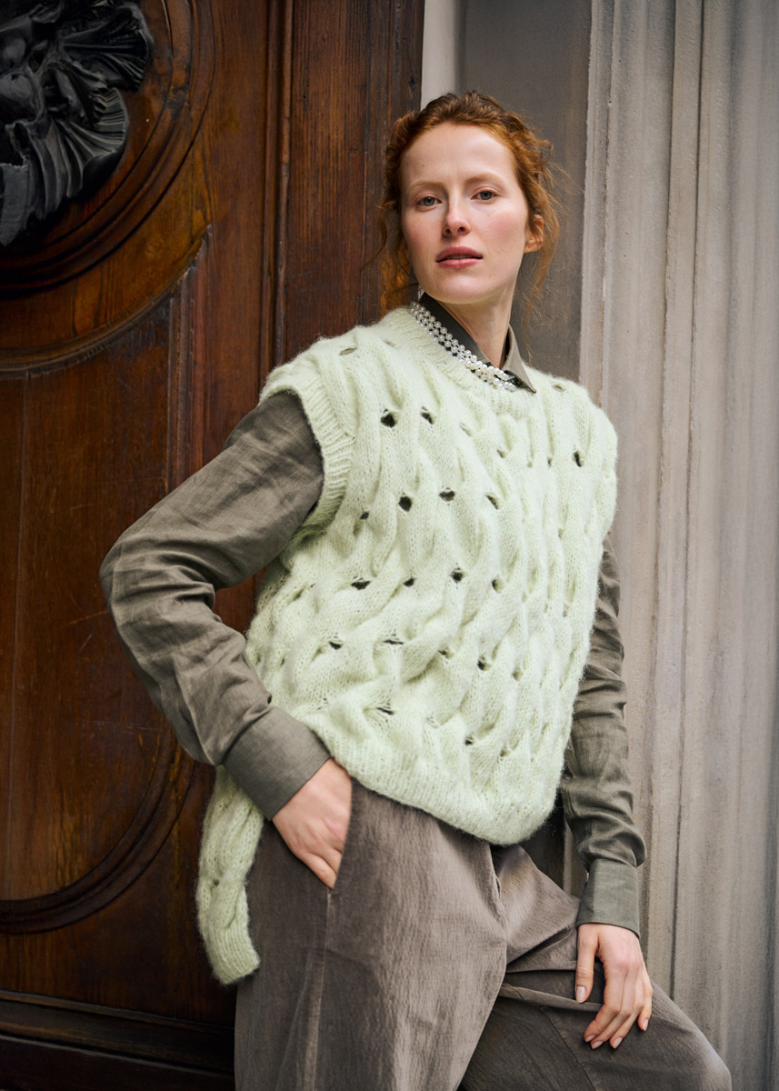 Lana Grossa qualité «Nebbia» (55 % laine vierge (mérinos extra fine), 45 % alpaga (baby), long. de fil = env. 170 m/50 g) : 350 (400 - 450) g en blanc/vert (col. 9) ; aig. à tric. n° 4,5 et 6 ; aig. circ. courte n° 4,5 ; 1 aig. à torsade