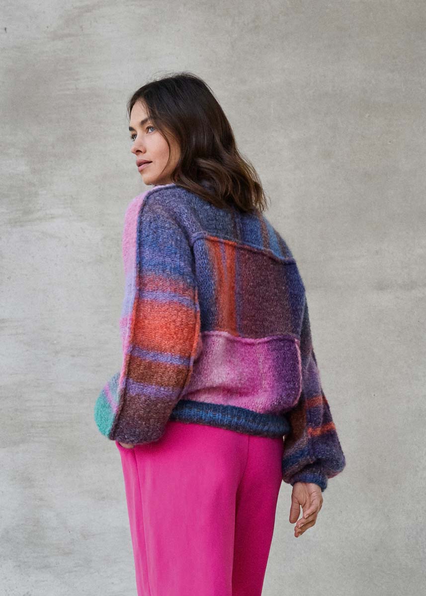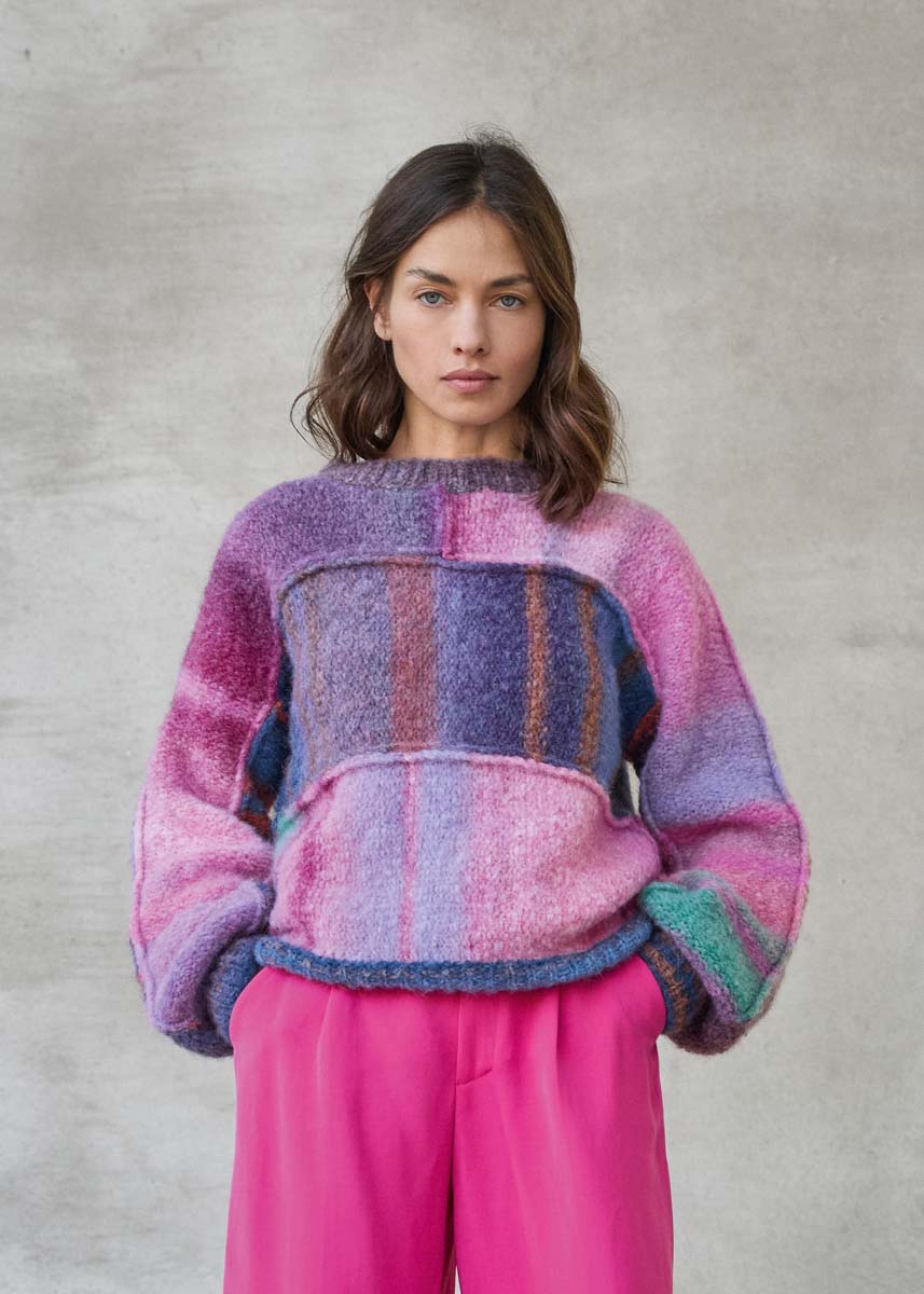 Lana Grossa qualité «Gigante Multi» (70 % alpaga (fine), 30 % polyamide, long. de fil = env. 150 m/50 g) : env. 200 (250 - 300 - 350) g en gris brun/bleu pétrole/mandarine/ gris rouge/violet foncé/lilas (col. 102) et 100 (150 - 150 - 200) g en mauve/ clou de girofle/rose vif/vert jade/gris rouge/rouge lie de vin/mûre/bleu violette (col. 107) ; aig. à tric. n° 6 ; 1 jeu d´aig. n° 5 et 1 aig. circ. longue n° 5.