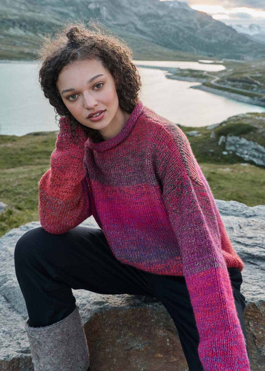 Lana Grossa qualité «Gomitolo Gala» (60% laine vierge, 38% polyacrylique, 2% polyester, long. de fil = ca. 700 m/200 g) : 2 (2 - 2 - 2) pelotes = env. 400 (400 - 400 - 400) g en bourgogne/noir rougeâtre/pourpre/bleu violacé/ bleu foncé/rouille/terre cuite (col. 4029) et 2 (2 - 2 - 2) pelotes = env. 400 (400 -400 - 400) g en gris brun/rouge lie de vin/rouge foncé/rouge cerise (col. 4031) ; aig. à tric. n° 5 et 6 ; aig. circ. courte n° 5.
