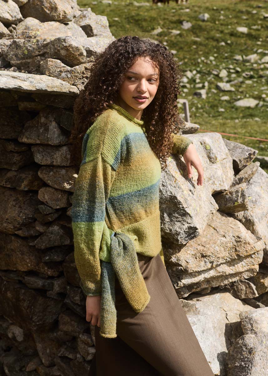 Lana Grossa qualité «Gomitolo Gala» (60% laine vierge, 38% polyacrylique, 2% polyester, long. de fil = env. 700 m/200 g) : 2 (2 - 3 - 3) pelotes = env. 400 (400 - 600 - 600) g en vert forêt/vert mousse/brun ocre/pistache (col. 4035) ; aig. à tric. n° 4 ; aig. circ. courte n° 3,5