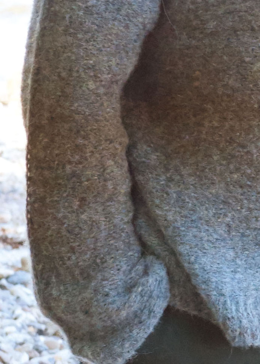 Lana Grossa qualité «Garzato Fleece Dégradé» (70 % (baby) alpaga, 30 % polyamide, long. de fil = env. 225 m/50 g) : env. 250 (300 - 350) g en gris clair/kaki/pétrole clair (col. 315) ; aig. à tric. n° 4 et 5, aig. circ. n° 4 de 50 cm de long