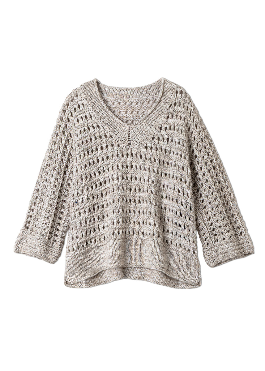 Lana Grossa Bottoni (53% coton, 24% viscose, 23% laine vierge (mérinos extrafine), long. de fil = env. 125 m/50 g), 300 (350 - 400) g en gris beige/ crème (col. 13) et Lana Grossa Landlust Sommerseide (50% soie, 50% coton, long. de fil = . 170 m/50 g), 250 (250 - 300) g en blanc (col. 1). Aig. à tric. n° 6 et 7 ainsi qu´une aig. circ. n° 6 de 60 cm de long ; 1 crochet n° 4,5. 3 aig. aux. pour mettre les m. en attente