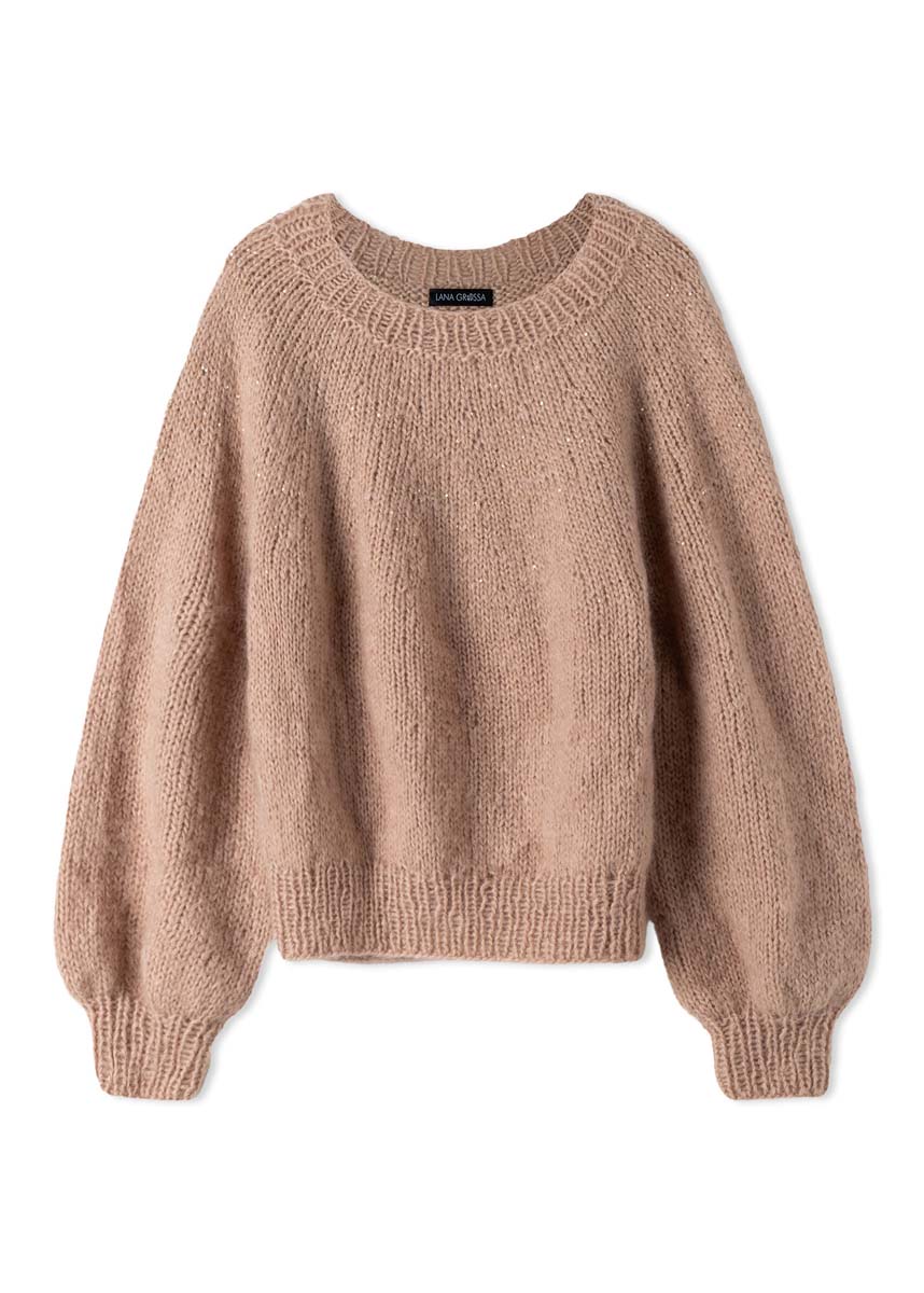 Lana Grossa qualité Mohair di Gio (55 % mohair (superkid), 45 % laine vierge (mérinos superfine), LL = env. 85 m/50 g) : 500 (550 - 600) g en beige (col. 8) et Lana Grossa qualité Glamour (55 % polyacrylique, 45 % polyester, LL = env. 112 m/50 g) : 25 g en beige (col. 10) ; aiguilles circulaires de 60 cm et 100 cm n° 7, jeu de 5 aiguilles n° 7 ; aiguilles circulaires de 50 cm, 80 cm, 100 cm et 120 cm n° 8 ; 4 marqueurs ; 2 aiguilles auxiliaires pour mettre des mailles en attente.