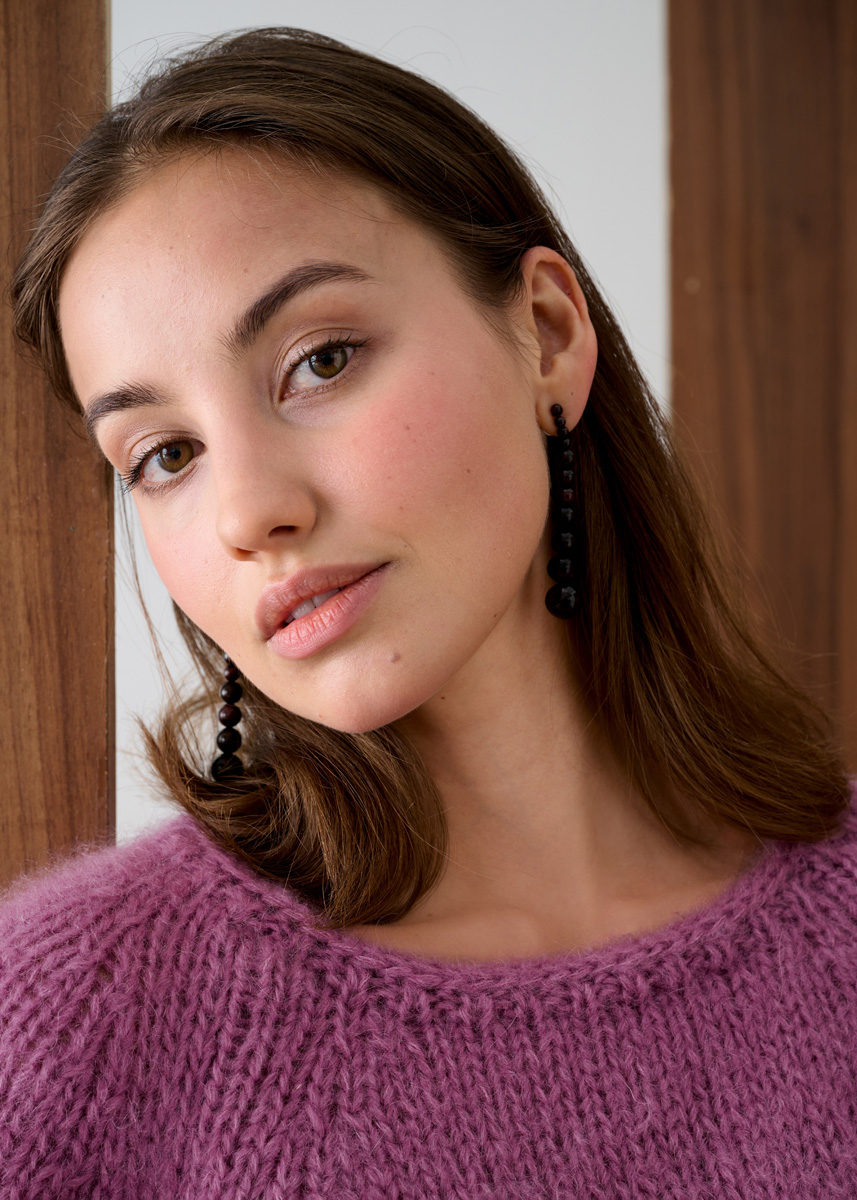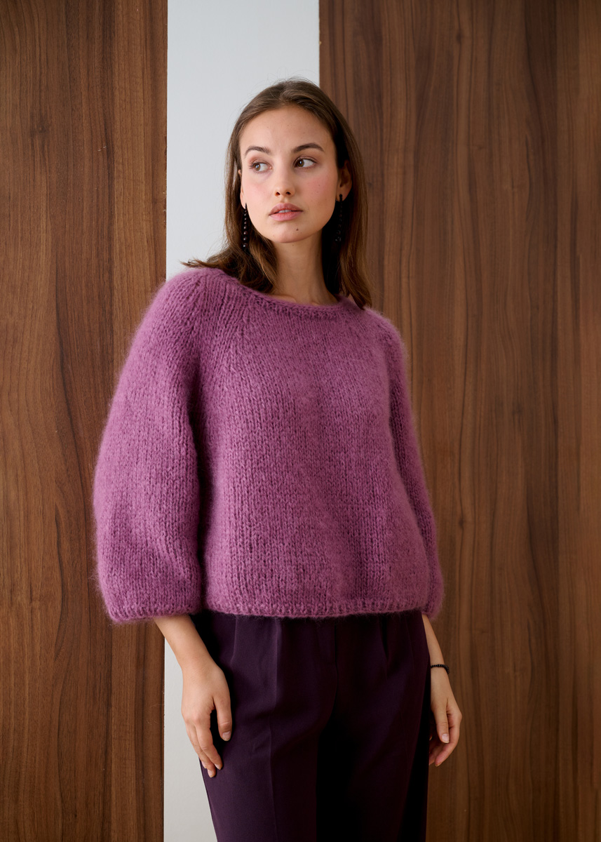 Lana Grossa qualité Mohair di Gio (55 % mohair (superkid), 45 % laine vierge (mérinos superfine), LL = env. 85 m/50 g) : 400 (450 - 500 - 550) g mauve (col. 4) ; aiguilles n° 7 et une aiguille circulaire n° 7 de 40 cm de long.
