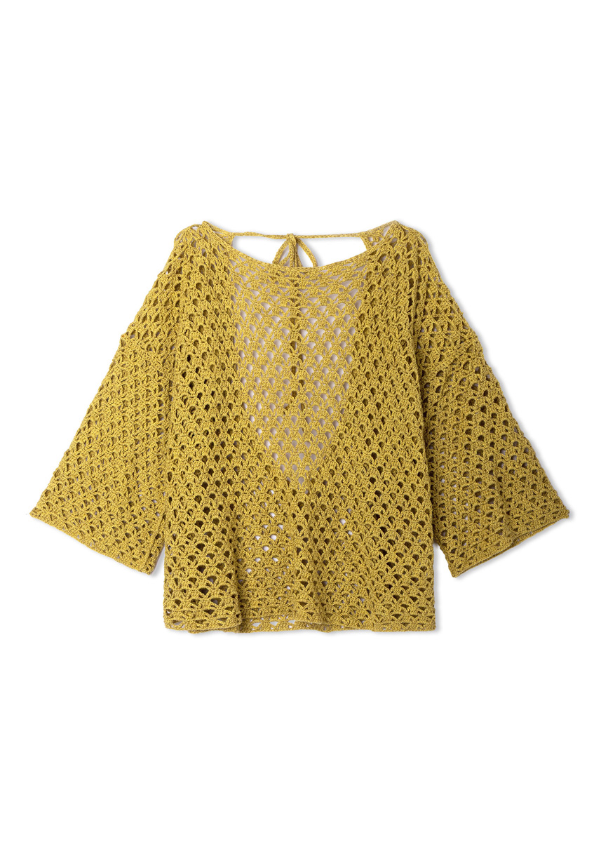 Lana Grossa « Diversa » (74 % coton, 26 % viscose, long. de fil = env. 210 m/50 g) : env. 350 g curry (col. 12) ; 1 crochet pour laine n° 3,5.