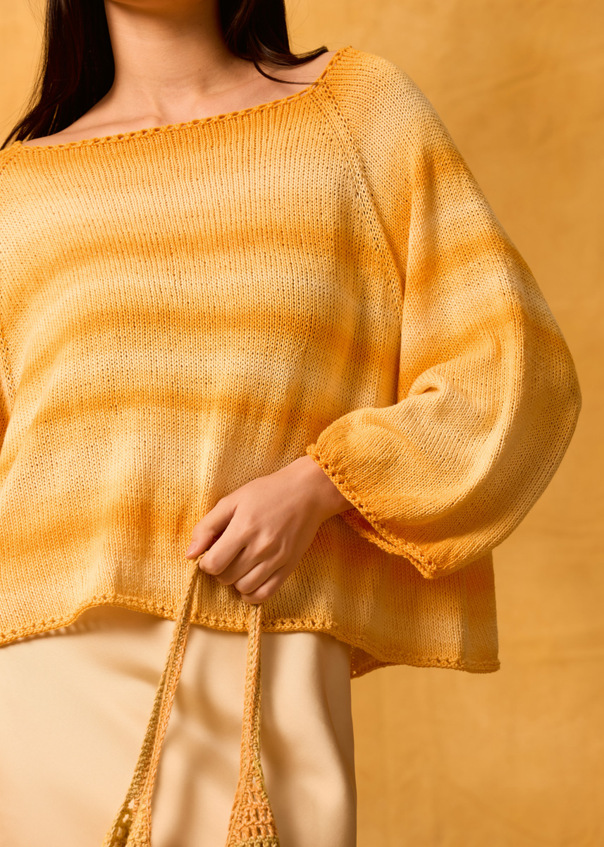 Lana Grossa qualité « Gomitolo Tono » (100% coton (bio), métrage = env. 360 m/100 g) : env. 4 (4 - 5 - 5) pelotes = env. 400 (400 - 500 - 500) g jaune clair/jaune/ jaune d’oeuf (col. 1041) ; aiguilles à tricoter circulaires courtes et longues de taille 3 et 3,5.