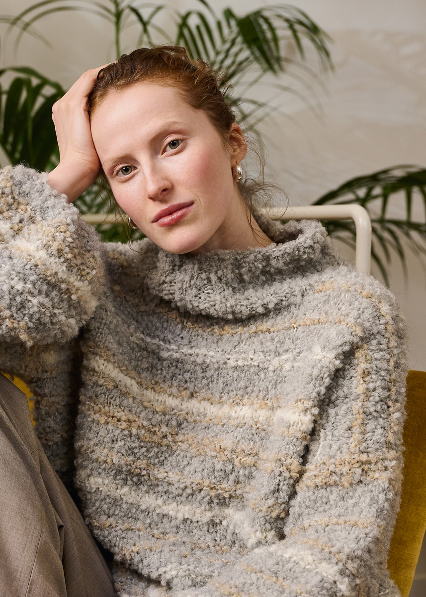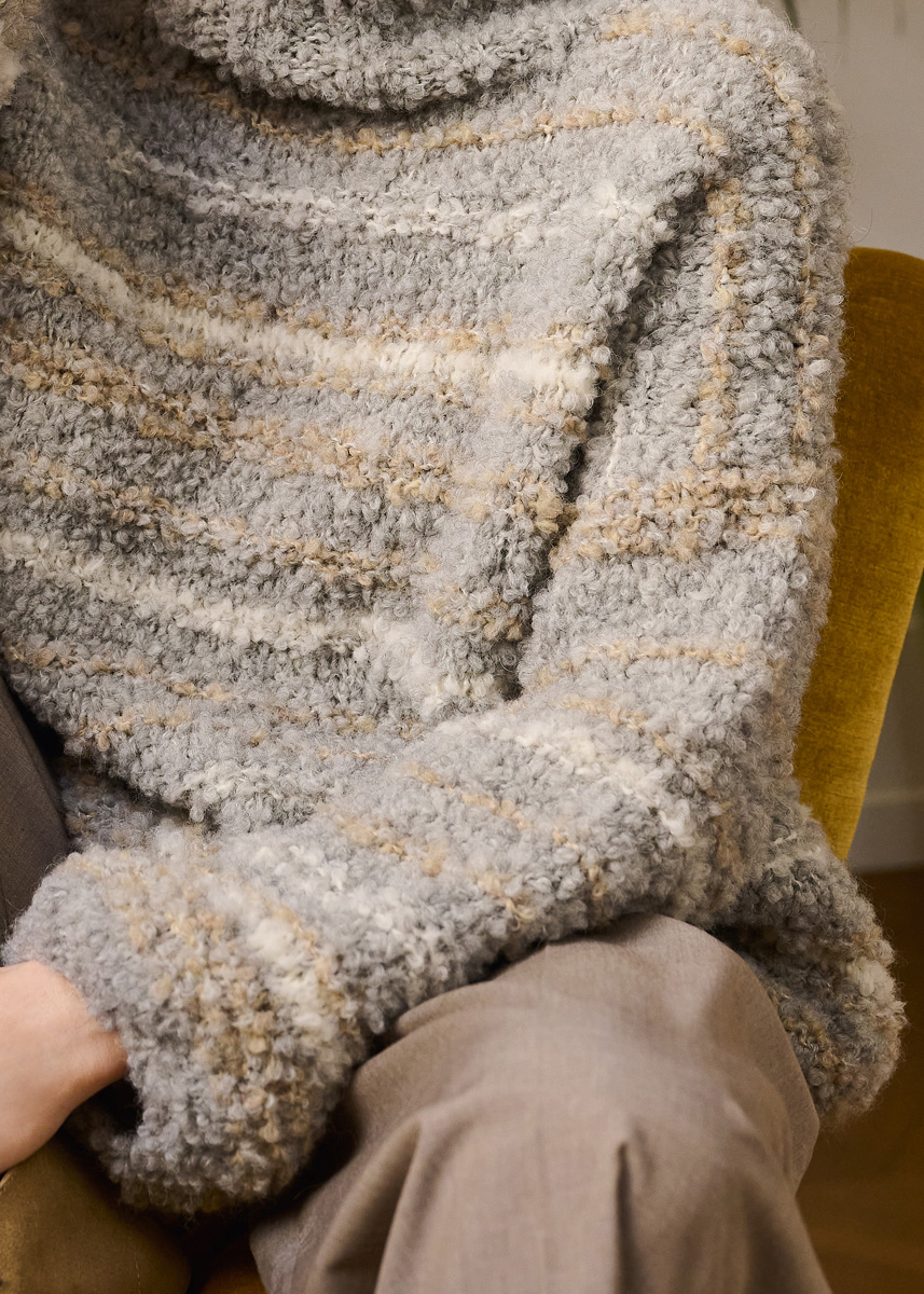 Lana Grossa qualité «Orsetto» (60 % laine vierge (mérinos), 40% alpaga (superfine), long. de fil env. 75 m./50 g) : env. 400 (450 - 500 - 550) g en gris clair (col. 14) ; env. 100 (150 - 150 -150) g en beige (col. 6) et env. 100 (100 - 100 - 150) g en écru (col. 16) ; aig. à tric. n° 6 ; aig. circ. courte n° 6.