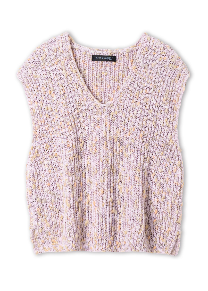 Fil Lana Grossa « Popcorn » (100% coton, métrage = env. 125 m/50 g) : env. 300 (350 - 350 - 400) g rose pastel/jaune pâle/gris clair/pêche (col. 4) ; Aiguilles à tricoter de taille 4,5 et taille 5 ; 1 aiguille circulaire courte de taille 4,5.