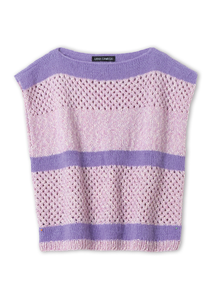 Lana Grossa « Setasuri » (69 % alpaga (suri), 31% soie, env. 212 m/25 g) : env. 50 (50 - 50 - 75) g violet (col. 46) ; Lana Grossa « Bottoni » (53% coton, 24% viscose (mérinos), 23% laine vierge (mérinos extrafine), métrage env. 125 m/50 g) : env. 200 (200 - 250 - 250) g lilas/blanc cassé (col. 5) ; aiguilles à tricoter de taille 4,5.