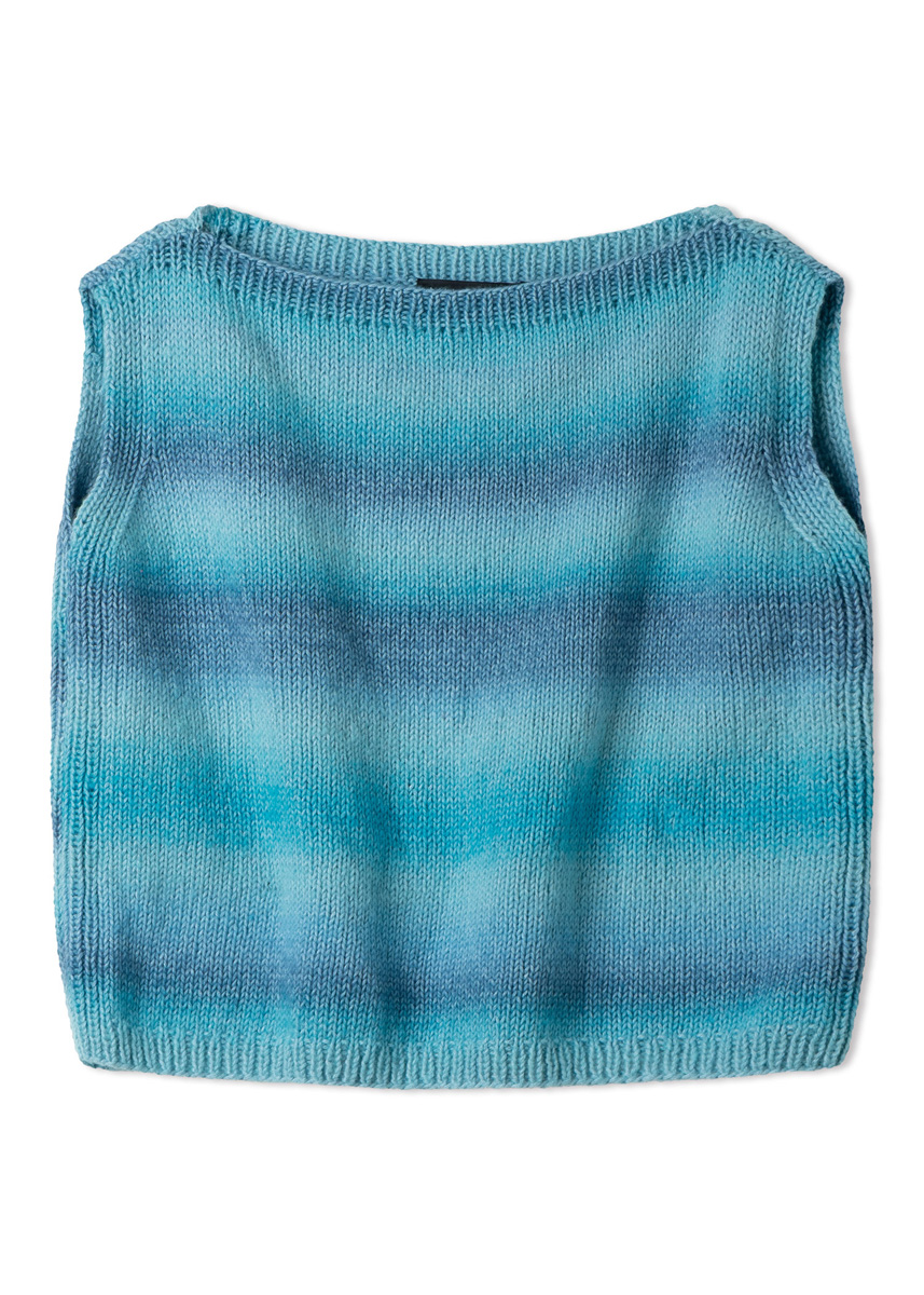 Lana Grossa qualité « Corallo » (70% coton (biologique), 30 % laine vierge (mérinos), métrage environ 210 m/100 g) : environ 300 (300 - 400 - 400) g turquoise clair/turquoise/jeans (col. 7) ; aiguilles à tricoter de taille 4 et 4,5.