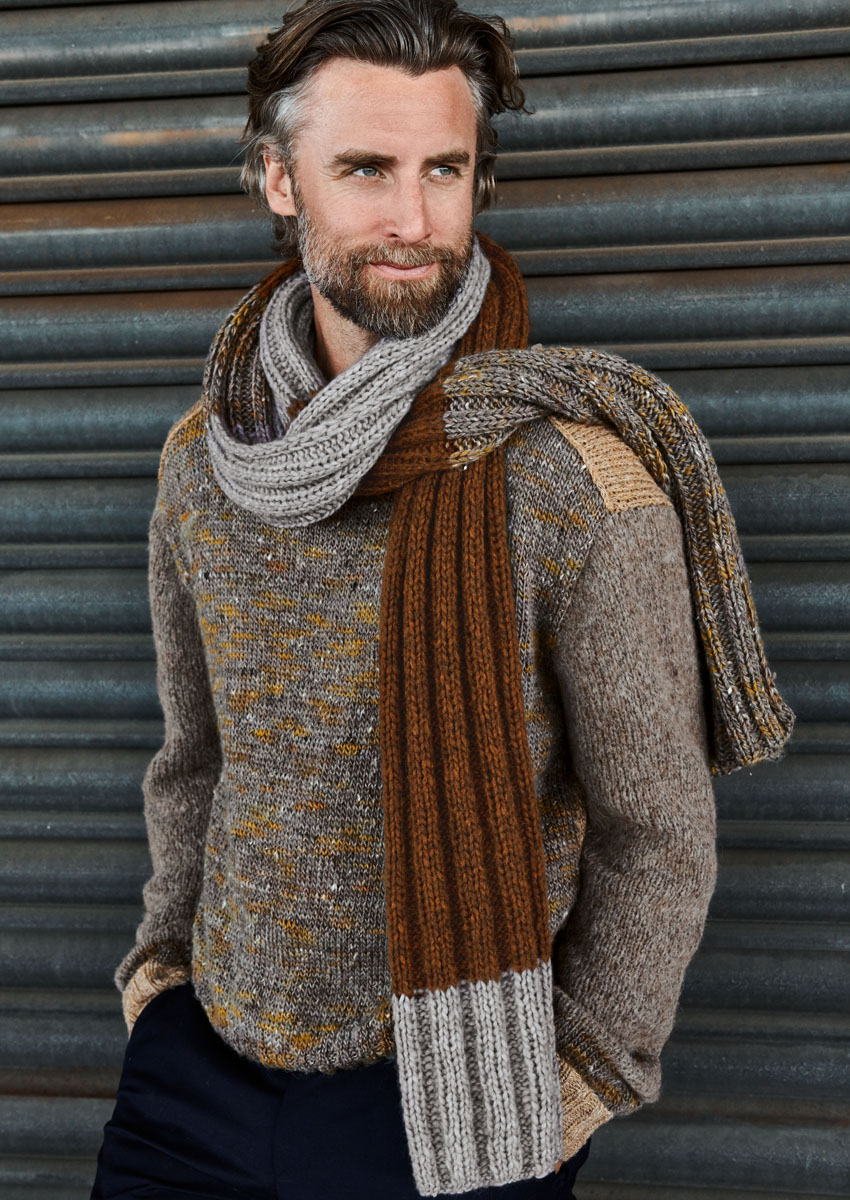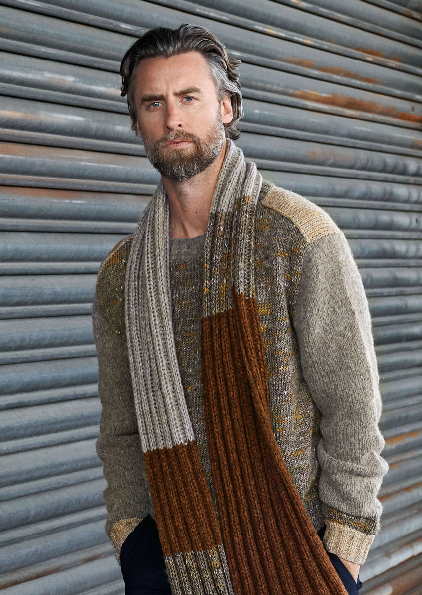Lana Grossa Smokey (46% laine vierge mérinos, 41% coton, 8% polyamide, 5% laine de yak, long. de fil 225 m/50 g), 150 (200 - 250) g en lin/beige/sable (col. 206), Lana Grossa Only Tweed (76% laine vierge mérinos superwash, 16% polyacrylique, 5% soie, 3% viscose, long. de fil 135 m/50 g), 150 (200 - 250) g en gris brun/beige/jaune moutarde/jaune ocre (col. 107) Lana Grossa Cool Air Fine (50% laine vierge mérinos, 28% baby alpaga, 22% polyamide, long. de fil 240 m/50 g), 100 (150 - 200) g en gris taupe (col. 11) ; aig. à tric. n° 3 et 5, 1 aig. circ. n° 3 de 40 cm de long