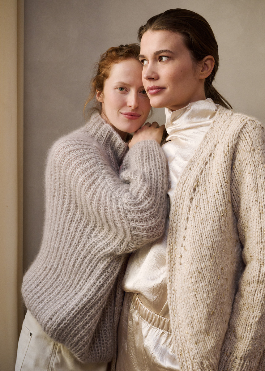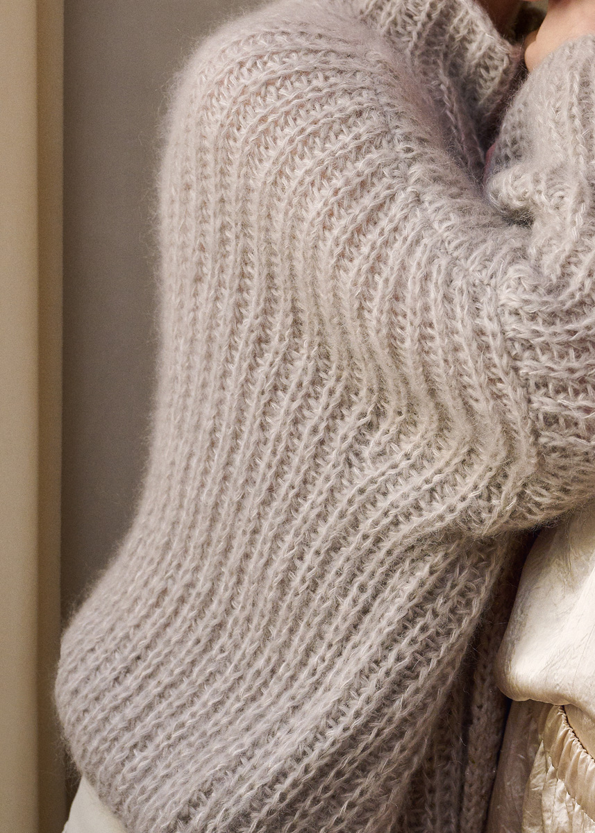 Lana Grossa qualité «Superkid Seta» (65% mohair (superkid), 35% soie, long. de fil = env. 100 m/25 g) : env. 200 (225 - 225 - 250) g en gris beige (col. 18) ; Lana Grossa qualité «Silkhair» (70% mohair (superkid), 30% soie, long. de fil = env. 210 m/25 g) : env. 225 (225 - 250 - 250) g en beige clair (col. 18) ; aig. à tric. n° 7 et 8 ; aig. circ. courte n° 7.