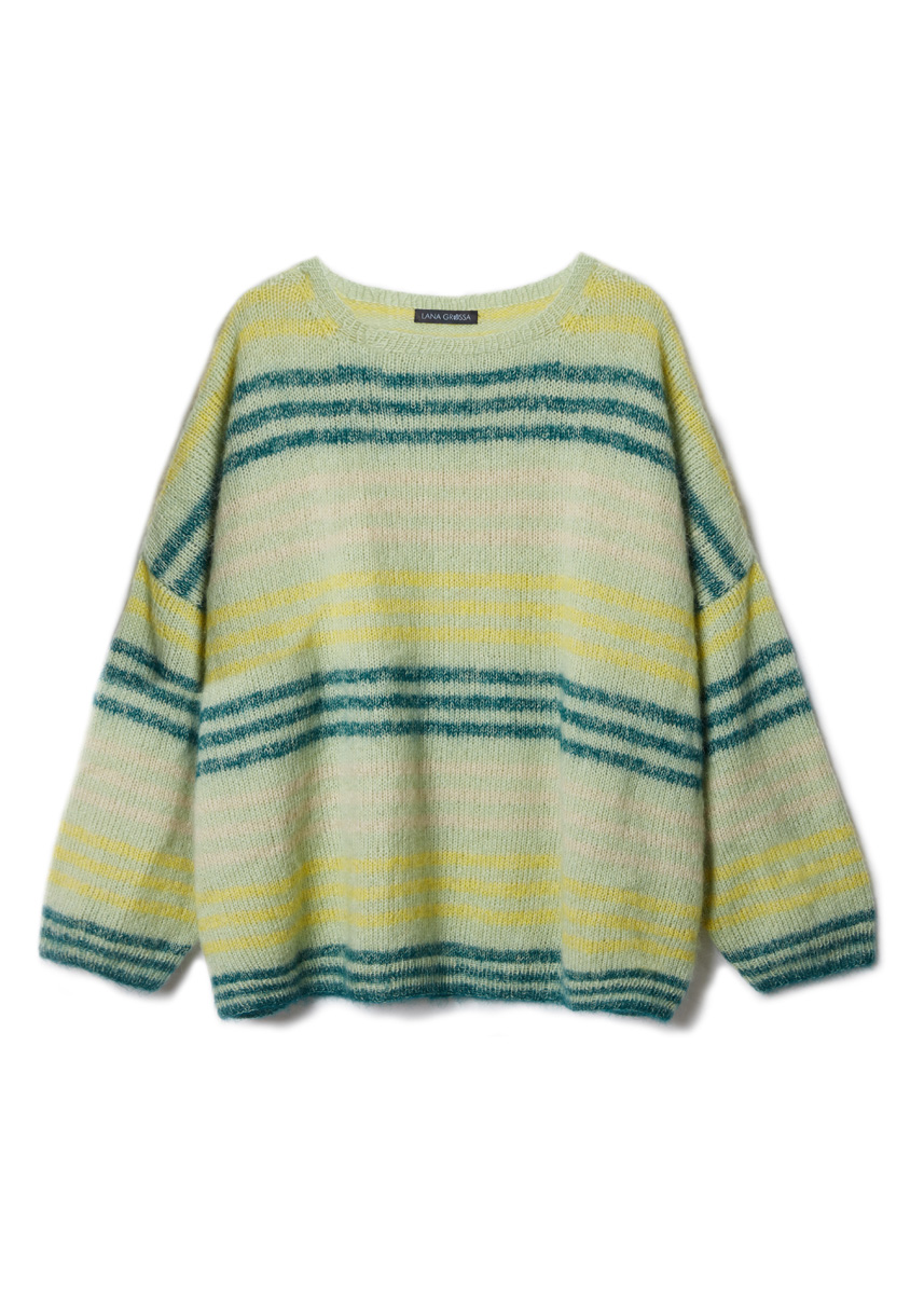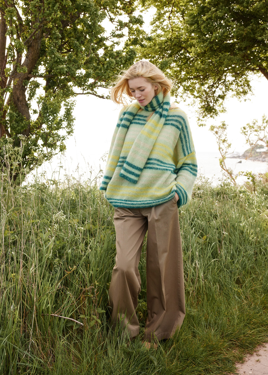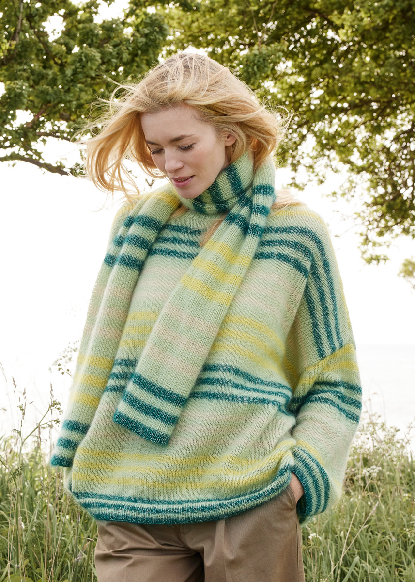 Lana Grossa Cool Wool Lace (100% laine vierge (mérinos extrafine), long. de fil 400 m/50 g), 200 (250 - 250 - 300) g en vert pastel (col. 65), Lana Grossa Silkhair (70% mohair (superkid), 30% soie, long. de fil 210 m/25 g), 125 (125 - 125 - 150) g en vert pâle (col. 211), 50 g en jaune narcisse (col. 217) et vert sapin (col. 219), 25 (25 - 25 - 50) g en beige poudré (col. 213), aig. à tric. n° 3 et 5. une aig. circ. n° 3 de 50 cm de long