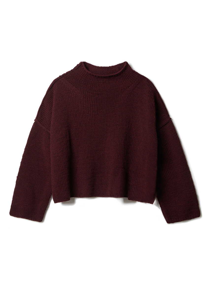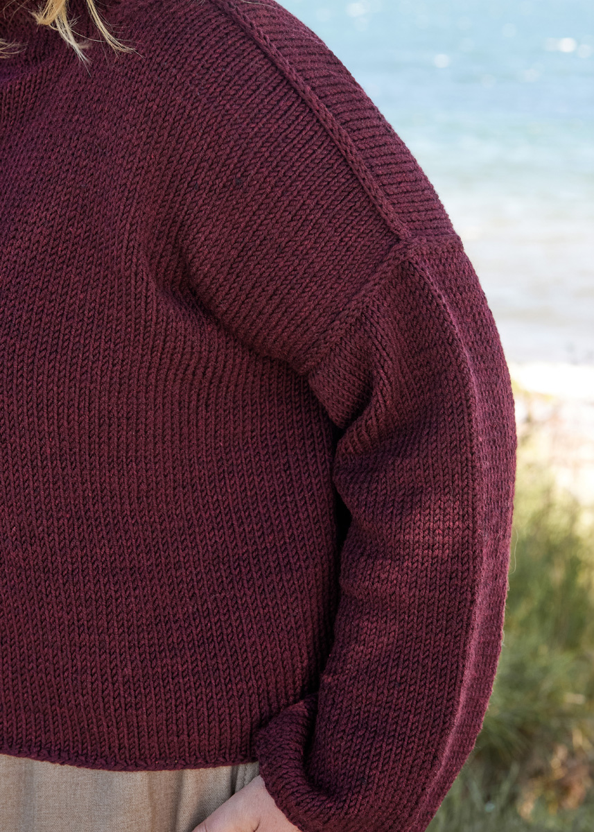 Lana Grossa Cool Wool Superbig Mélange (100% laine vierge (mérinos extrafine), long. de fil 80 m/50 g), 550 (600 - 650 - 700 - 750) g en bourgogne chiné (col. 203). Aig. à tric. n° 5 et 6 ; 1 aig. aux. pour mettre les m. en attente.