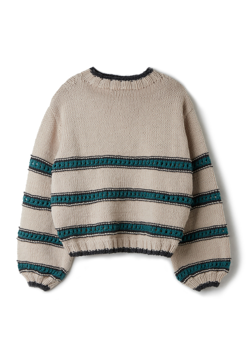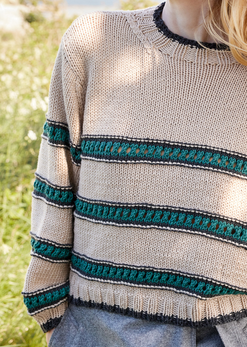 Lana Grossa Cool Wool Superbig Mélange (100% laine vierge (mérinos extrafine), long. de fil 80 m/50 g), 400 (450 - 450 - 500 - 550) g en beige chiné (col. 214), 100 (150 - 150 - 200 - 200) g en gris foncé chiné (col. 218) et 100 (100 - 100 - 150 - 150) g en vert foncé chiné (col. 210). Aig. à tric. n° 5,5 et 6. Cinq aig. d´1 jeu d´aig. n° 5,5