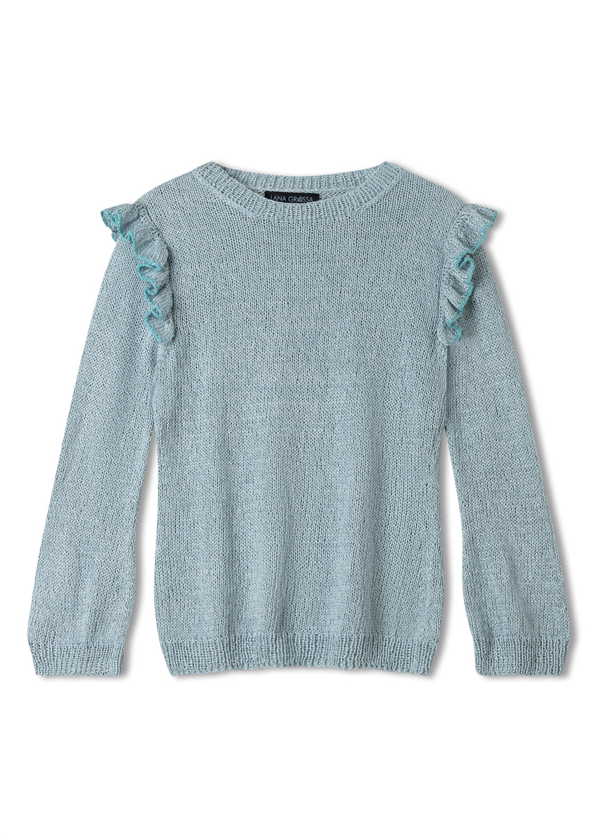 Lana Grossa Tencellino (51 % coton, 49 % tencel, long. de fil = env. 125 m/50 g), 350 (400 - 450) g en bleu givré (col. 9). Lana Grossa Filo Paillettes (55% coton, 39% polyester, 6% polyamide, long. de fil = env. 155 m/50 g), 50 g en turquoise (col. 11). Aig. à tric. n° 3,5 et 4, une aig. circ. courte n° 3,5.