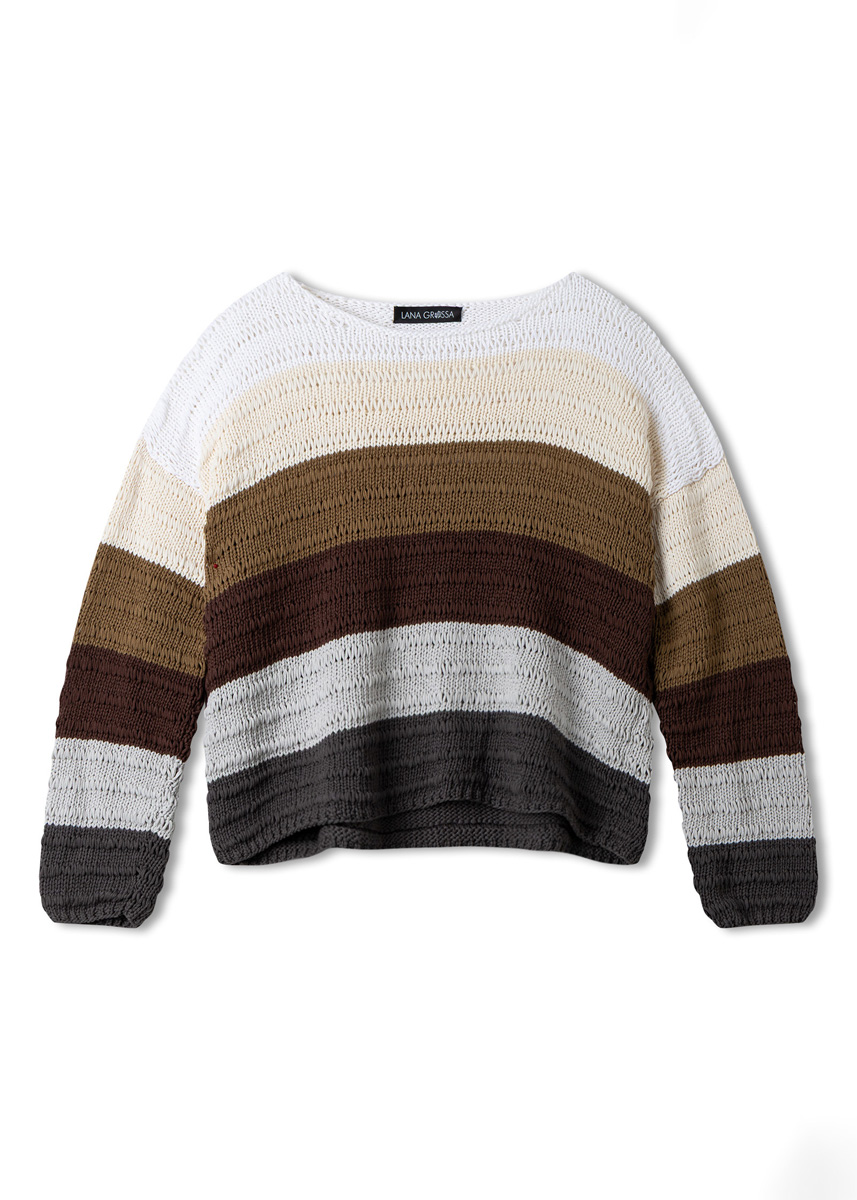 Lana Grossa Tessera (100% coton, long. de fil 115 m/50 g), 100 (100 - 100 - 100) g en blanc (col. 20), brun vert (col. 18), brun foncé (col. 17) et gris argent (col. 14) et 100 (100 - 150 - 150) g en crème (col. 19) et gris foncé (col. 15) ; aig. à tric. n° 5,5, aig. circ. n° 5,5 de 40 cm de longueur