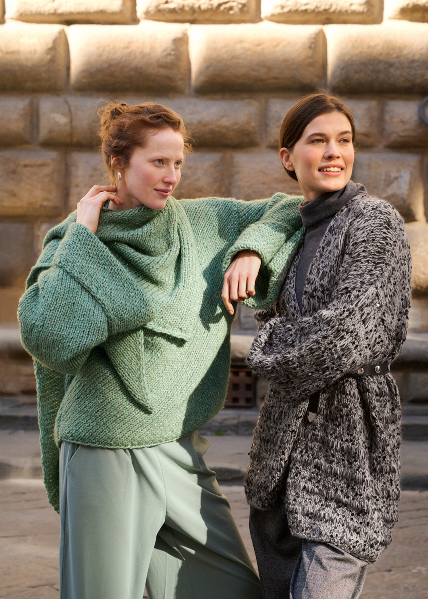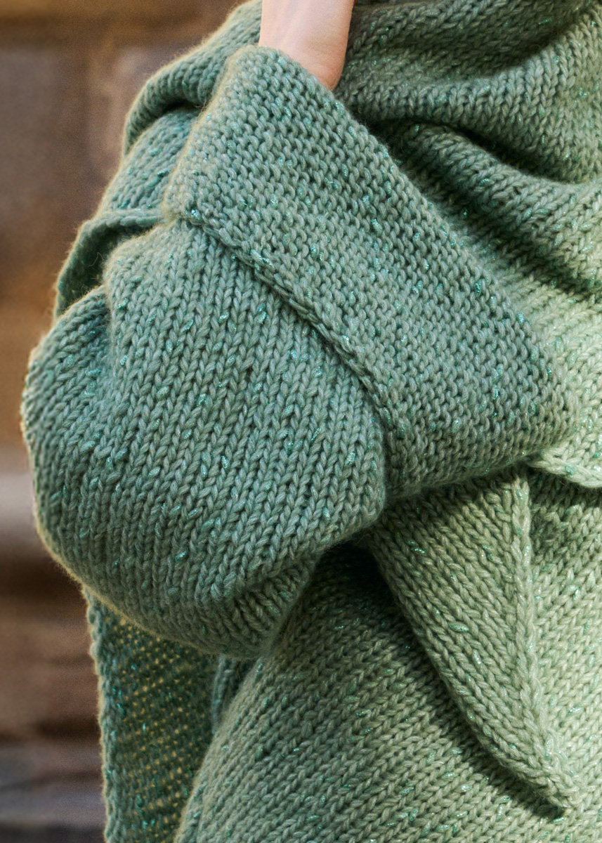 Lana Grossa qualité «Lucciola» (29 % polyamide, 24 % laine vierge (mérinos extra fine), 22 % viscose, 20 % alpaga (baby), 5 % de fibres métallisées, long. de fil = env. 130 m/50 g) : env. 600 (650 - 700 - 750) g en vert (col. 3) ; aig. à tric. n° 9 ; crochet n° 9.
