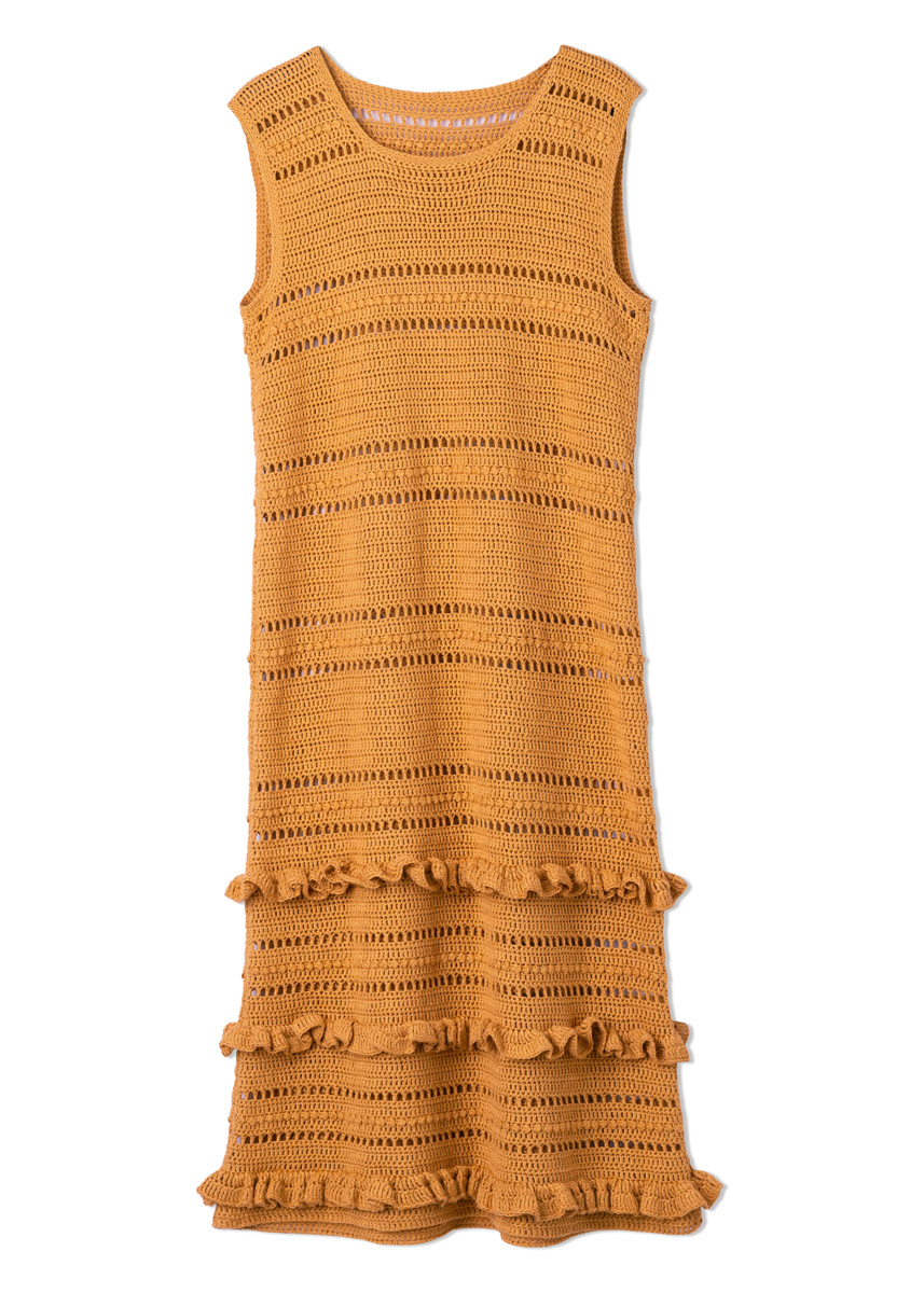 Lana Grossa « Campo » (65 % coton, 25 % viscose, 10 % lin, long. de fil = env. 165 m/50 g) : env. 700 (750) g jaune d’or (col. 29) ; 1 crochet n° 3,5.