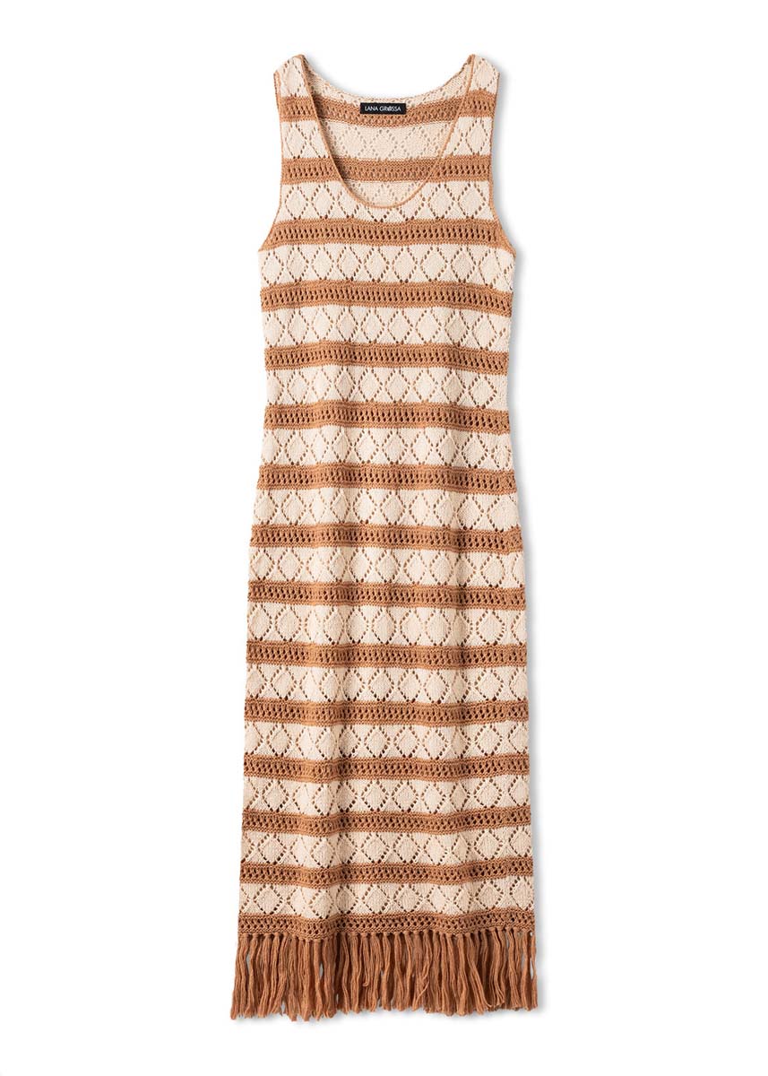 Lana Grossa « Sottile » (85 % coton, 15 % pure laine (mérinos), longueur de fil 250 m/50 g) 200 (250) g en beige clair (col. 17) et 200 (200) g en camel (col. 24), aig. à tric. N° 3, 1 aig. circ. N° 3 de 50 cm de long, 1 crochet N° 3