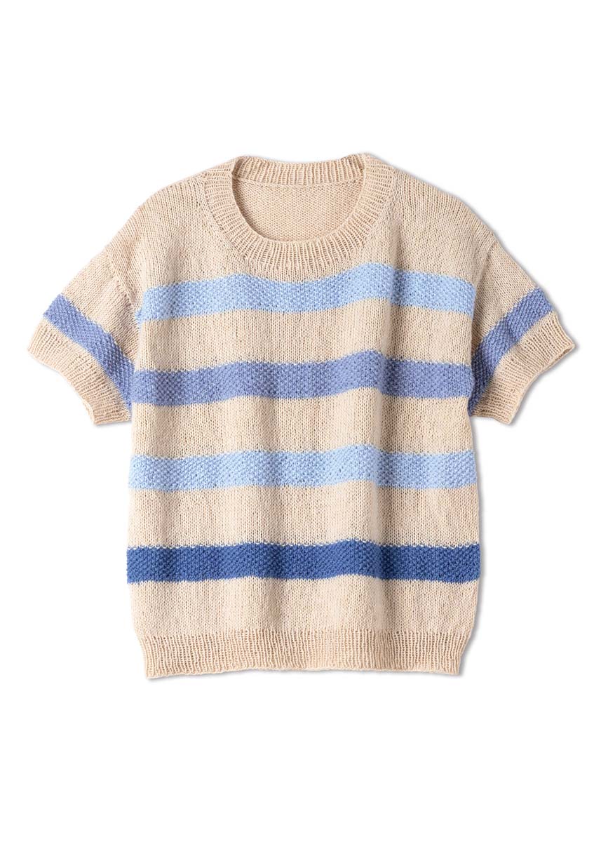 Lana Grossa qualité "Ecopuno" (72% coton, 17% laine vierge (mérinos), 11% (baby) alpaga, longeur de la bobine = env. 215 m/50 g) : env. 200 (250) g de beige perle (col. 66) et env. 50 g chacun de bleu gentiane (col. 213), bleu pastel (col. 207) et bleu clair (col. 13) ; aig. à tric. N° 4, 1 aig. à tric. circ. N° 4, 80 cm de long, 1 aig. à tric. circ. N° 3,5, 40 et 80 cm de long.