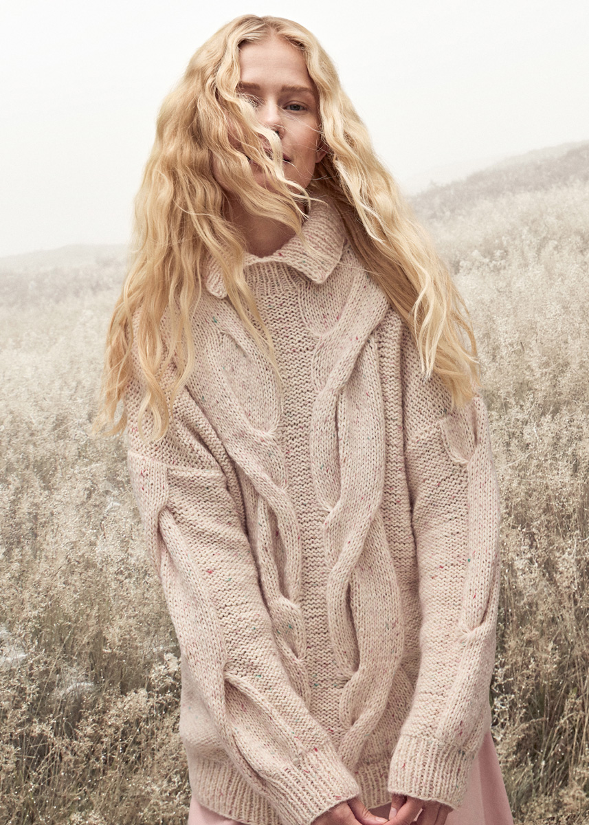Lana Grossa «Ecopuno» (72 % coton, 17 % laine vierge (mérinos), 11 % (baby) alpaga, long. de fil 215 m/50 g) : 650 (700 / 750 / 800) g en écru (col. 46) et Lana Grossa «Natural Superkid Tweed» (60 % mohair (superkid), 30 % soie, 7 % coton, 3 % polyester, long. de fil = 200 m/25 g) : 175 (175 / 200 / 200) g Rosé (col. 629) ; aig. circ. de 5,5 mm et 6 mm, de 80 à 100 cm de long ; une aig. circ. de 5,5 mm, 40 cm de long (ou tric. avec la méthode du Magic-Loop (page 64)), 1 aig. aux.